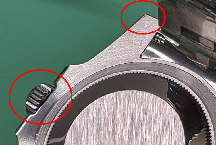 山寨綠水鬼錶耳背面的稜角相當銳利,一如黑水鬼那篇提到的,你把它拿來劃劃過自己的手臂,山寨綠水鬼是有可能劃傷自己的皮膚的,正貨當然就不會有這樣傷人的銳角。另外山寨綠水鬼的錶冠也是一個觀察重點,山寨的拋光不夠確實,刻槽尖角過於銳利,反之正貨只有在齒狀的平面部分(而非邊緣部分)銳利,拿正貨和山寨品一比,可以發現山寨品的拋光和倒角都只是點到為止、不夠確實。