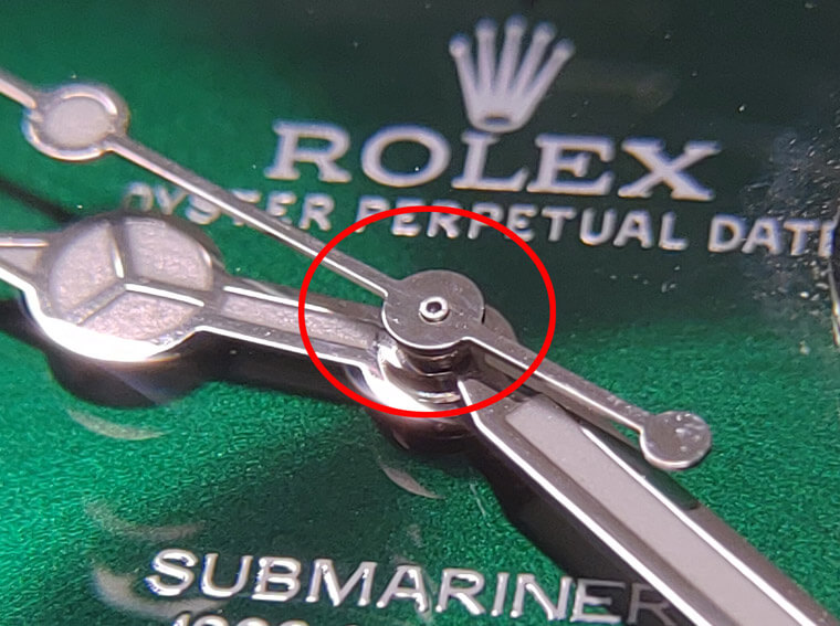 從面盤中軸最頂端的秒針軸心部分可以看出山寨錶沒有像正貨一般的漂亮倒角處理,不過目前有些仿3135版本的山寨綠水鬼可能是因為指針供應商不同的關係有稍微修正這個部分,但是正貨的倒角拋光還是圓滑光亮許多。