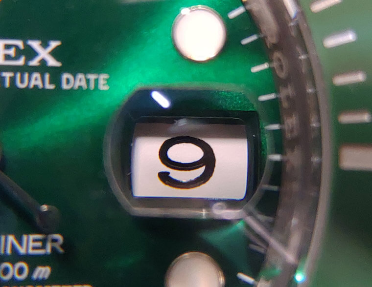 目前山寨綠水鬼的日期字體幾乎都修正為跟正貨一樣,但是山寨品在轉印日期數字時火候還是差了些,例如它的數字邊緣會有一些不過工整的毛邊,只要拿放大鏡一看就很容易看出它的工法不夠細膩。