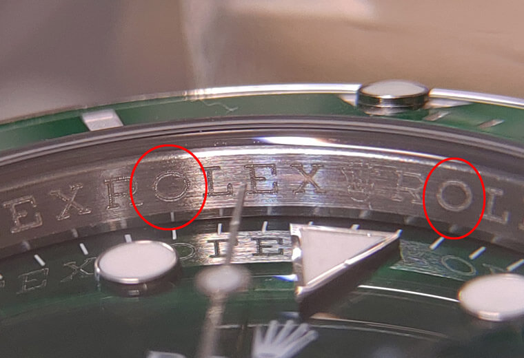面盤邊緣的勞力士刻字過往是品牌防偽的設計之一,不過目前山寨錶也都如法炮製一番,這部分要做的像取決於雷射頭波長與功率還有雕刻速度的設定等等,山寨錶的問題在於它在前面三個元素的設定沒有到位,所以會導致每個字母的深度與平整度不均勻。不過這個瑕疵最近在N廠的新版本中卻有被修正的跡象,N廠新款目前已經採用雙層雷雕的方式,以ROLEX的”O”字來看,N廠會用很細的雷射在字體周圍再刻一次,而圖中屬於AR廠的山寨綠水鬼,只有一層雷雕,所以字母的層次感比較不明顯。