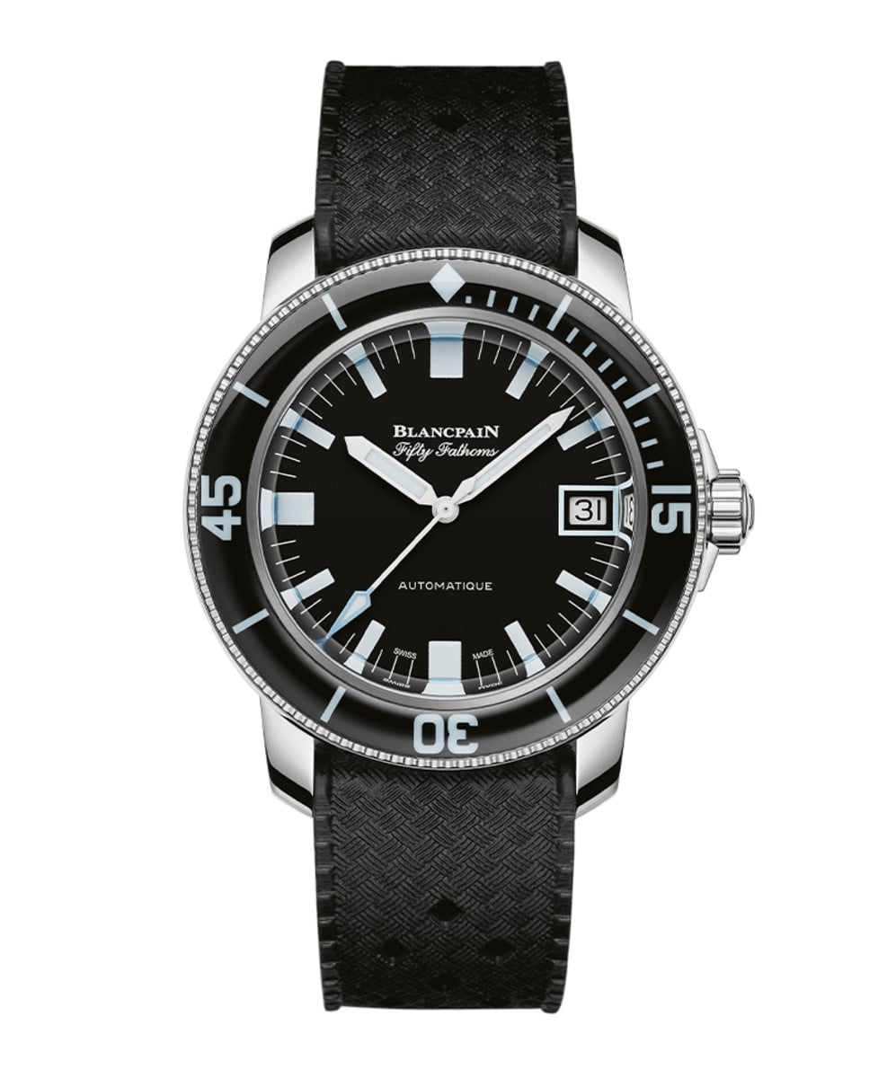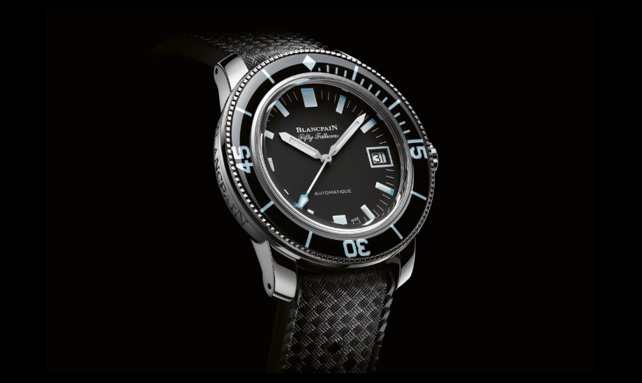 全新五十噚Barakuda Only Watch手錶不僅回歸原腕的美學特質,亦將寶珀長久以來在製錶領域積累的豐富經驗及技術創新發揮至極致。手錶採用黑色面盤,搭配塗覆Super-LumiNova藍色夜光塗層的白色時標,並搭配同材質指針及錶圈。其中鉛筆形指針覆以白色塗層,秒針則鑲以淺藍色邊。原型錶的關鍵元素——日期顯示,以視窗的形式在新型錶款中回歸初代手錶的相同位置。