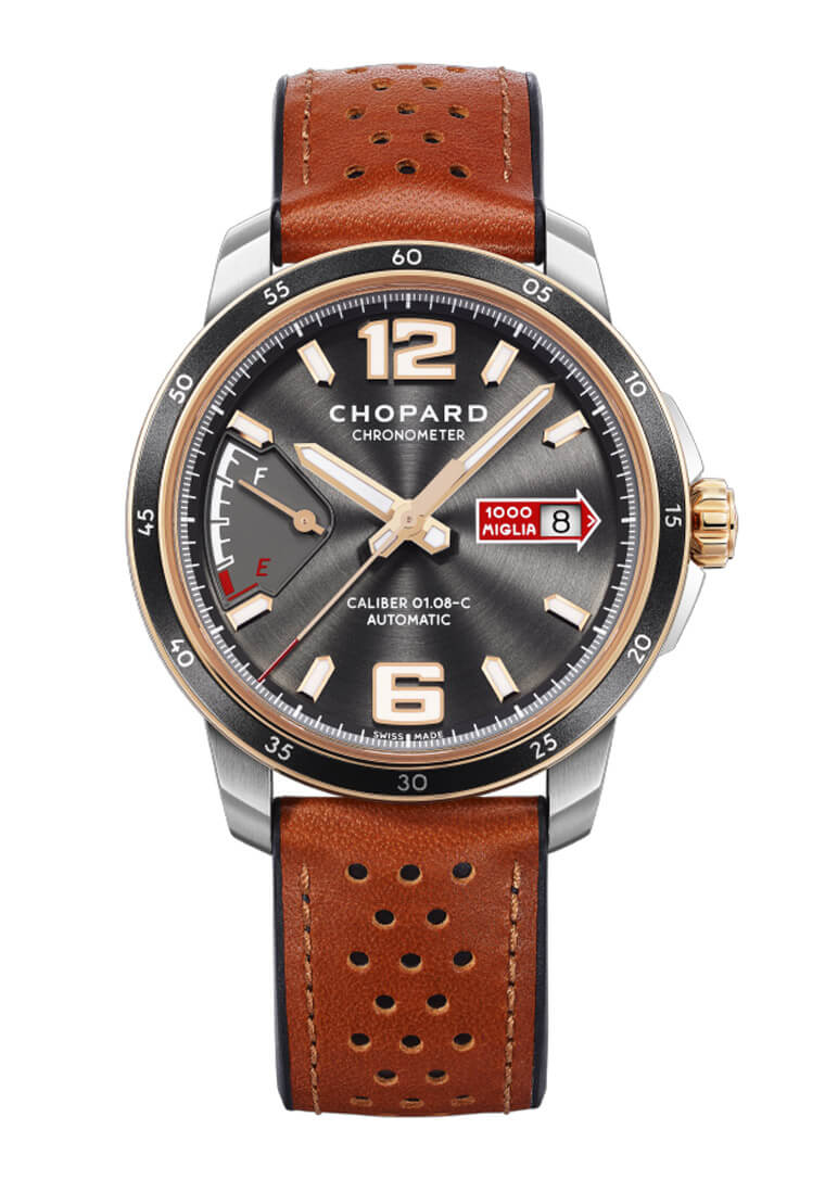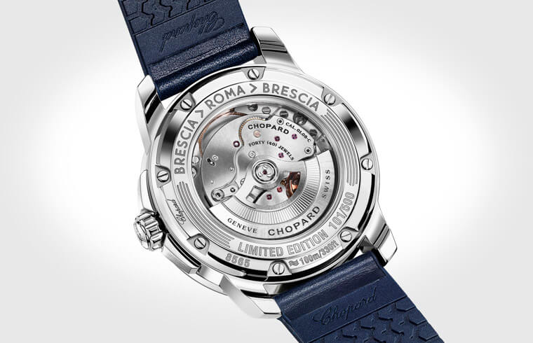 手錶搭載獲天文台精密時計認證的01.08-C自動上鍊機芯,具備60小時動力儲存,足以征戰長途賽事的挑戰。為滿足對機械機制與優美設計線條同樣考究的紳士車手,透明錶底蓋標示有"Brescia-Rome-Brescia"字樣,呼應「世上最美麗的賽事」1,000英里賽程。