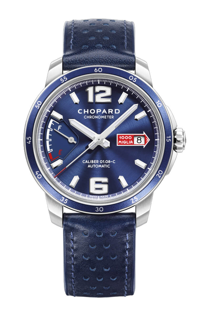 3時位置日期視窗的外框則以微縮形式重現比賽公路上標記的著名"1000 Miglia"方向箭頭。手錶配備的錶帶,搭配採用1960年代鄧祿普輪胎花紋圖案的橡膠內襯,突顯此款賽車腕錶的運動性能。
