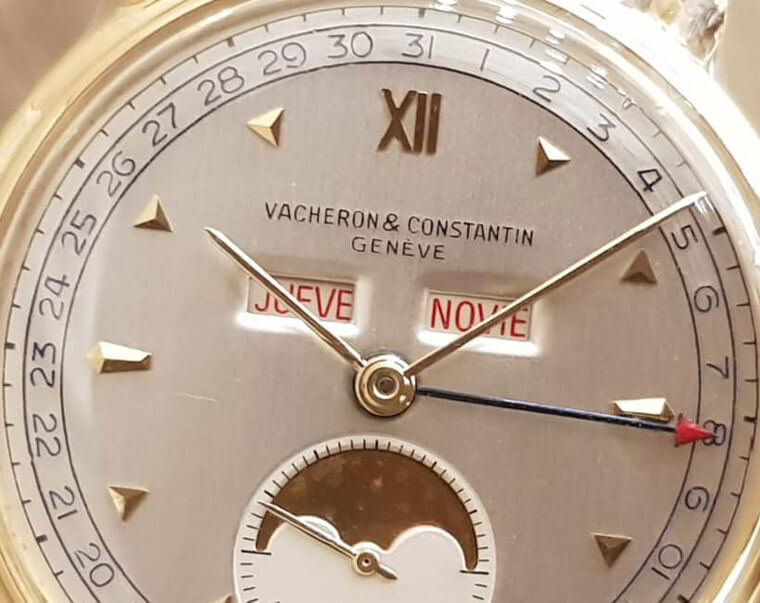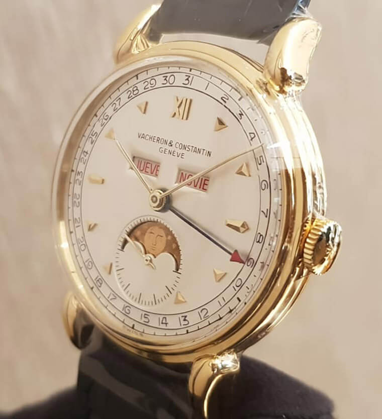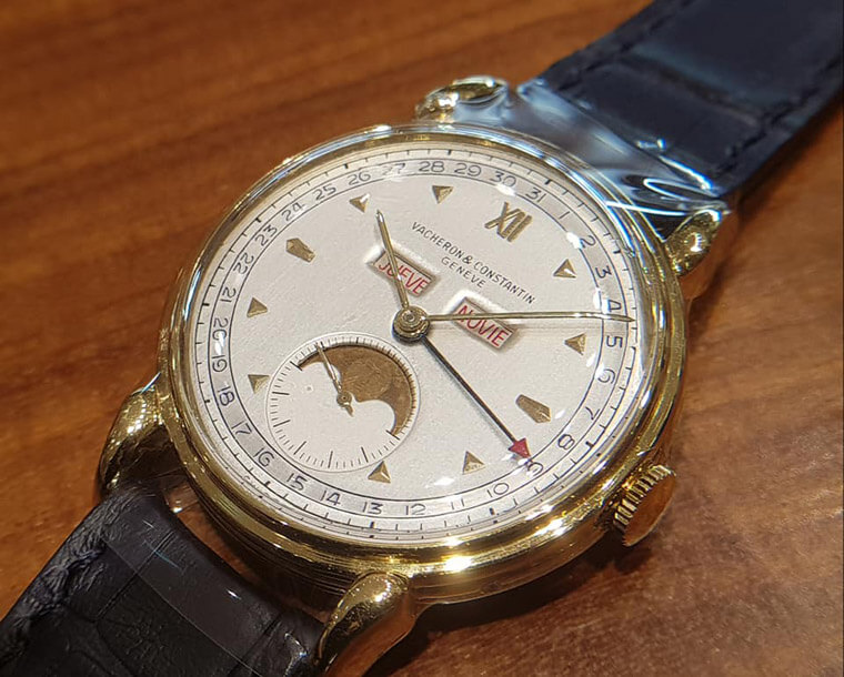 ▲1942年VC推出首款三曆月相錶,本錶為1949年生產,指針與時標皆為K金材質,品相非常好,參考價為台幣117萬。