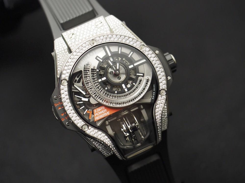 宇舶錶挑戰多軸陀飛輪的極限,Manufacture Pieces系列的第9號作品MP-09雙軸陀飛輪腕錶,運用雙重旋轉框架,將陀飛輪的律動美感發揮到極致。為了展現雙軸陀飛輪最大的動態表現性,宇舶以專業複雜功能機芯的表現為前題,打造原創錶殼及機芯。MHUB9009.H1.RA手上鍊機芯,第一軸以一分鐘一圈旋轉,第二圈則是30秒一圈。陀飛輪置於6點鐘位置的大型開放視窗,以結構複雜的立體三面藍寶石鏡面打造出華麗舞台。