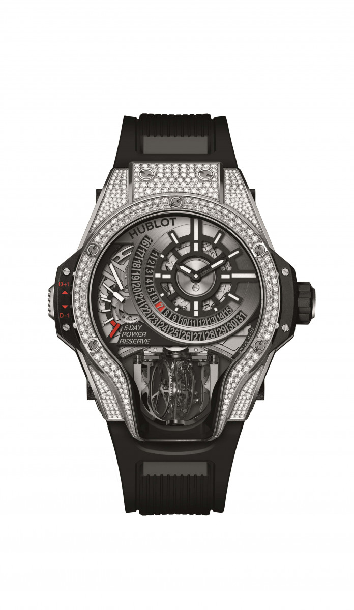 錶款具有特殊日期顯示系統,創新造型又符合實際操作性。經由按把上下移動操作日期數字,以天為單位向前或向後移動。瞬跳日期以兩個半圓盤顯示於偏心小時與分鐘顯示盤的周邊,分別顯示1-15、以及16-31的單獨數字日期。這款錶完美反映宇舶錶挑戰不可能的品牌哲學。