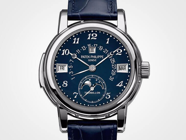 6300實際上是百達翡麗在2014年為了慶祝創廠175週年所推出紀念款5175R的市售版,由於5175R當年只限量推出7只,讓許多有興趣也有預算的收藏家只能望錶興嘆,因此到了2016年PP就發表了Grandmaster Chime 6300G,型號雖然不盡相同,外型設計也有些調整,但兩款搭載的其實是同一枚GS AL 36-750 QIS FUS IRM機芯,它除了有雙面面盤設計集結多達20種功能,這款本身光報時功能就很不一般,因為它包括大、小自鳴、三問、鬧鈴,乃至日期報時等,幾乎是百達翡麗在今日研發報時功能的最高成就了。繼2016年的黑、白雙面版本,2019年改款的6300G一樣是白金錶殼,但是雙面面盤改成同樣的藍色調,搭配藍色鱷魚皮錶帶,展現另一種不同個性。