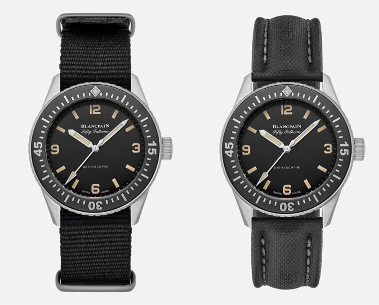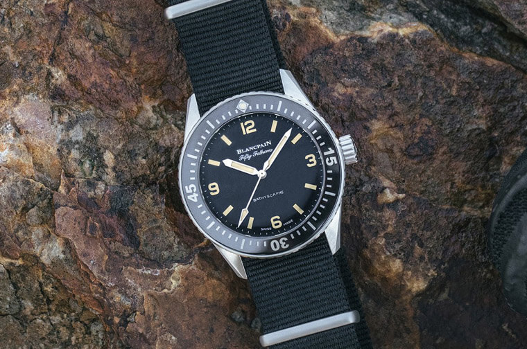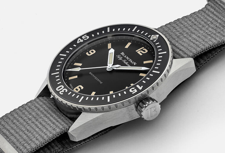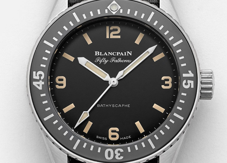話說前不久Hodinkee與BLANCPAIN寶珀攜手推出了一款Fifty Fathoms Bathyscaphe限量錶,錶款以五十噚Bathyscaphe前兩年推出38mm錶徑版本為基礎,外觀其實與一般的Bathyscaphe大同小異,例如它採用不鏽鋼材質、陶瓷錶圈,錶圈上有60分鐘刻度等等,錶殼造型也沒有什麼明顯的變動,不過在一些細節設計上,這款錶又展現出與市售Bathyscaphe同中求異的新意。