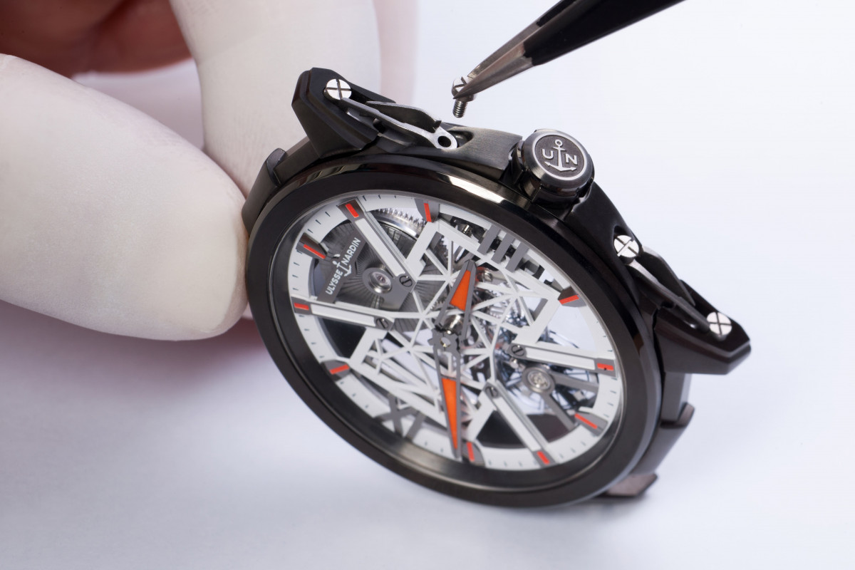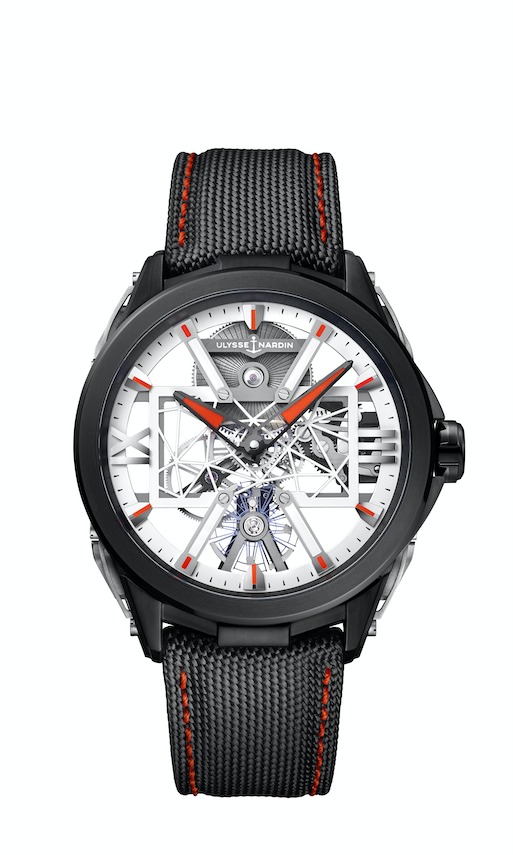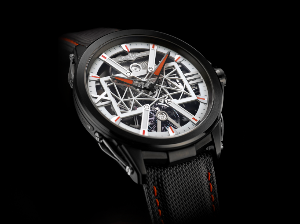 鏤空X手錶於錶殼採用仿生外觀,突顯了手錶的人體工學設計。柔性雙薄片由兩枚螺釘固定,一枚位於外殼,另一枚位於錶耳。錶耳橫杆與錶殼之間有一定的移動空間,從而提升了手錶的靈活性。該款手錶搭配了易於調節的非一體化錶帶,強化其人體工學特色。這種織物錶帶令人聯想起醫學外骨骼的軟帶,其設計完美貼合手腕。煙灰色PVD錶圈,搭配時標以及指標上鮮豔的橙色Super-LumiNova夜光塗層,大大增加了手錶的吸引力。