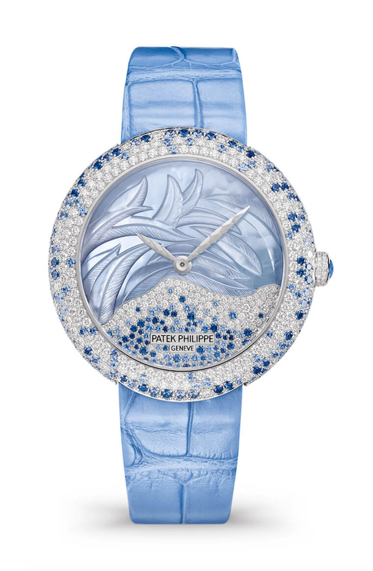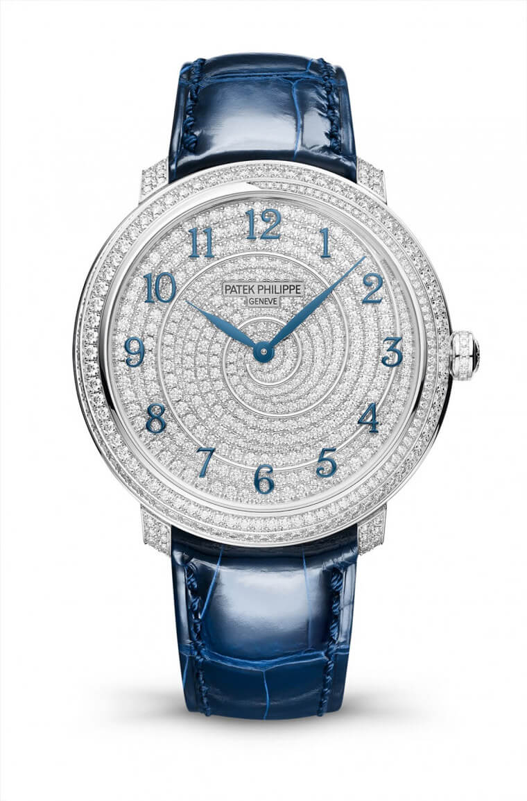 編號4899的Calatrava高級珠寶腕錶,腕錶裝飾展露濃厚的女性氣質,把白金、珍珠和寶石薈萃在錶上。今年百達翡麗再次推出全新的藍調款式,錶殼鑲亮眼鑽石,面盤裝飾了精美的藍色羽毛圖案,展現全新面貌。圓潤的白金錶殼上鑲滿了鑽石,並以圓形切割藍寶石點綴其中。面盤下半部以隨意式或雪花式方式混合鑲嵌鑽石和深淺不一的藍寶石。而上半部則以珍珠母打造,並且手工刻上精美的藍調羽毛圖案,配有雕刻處理的白金葉形時針和分針,和羽毛圖案相得益彰。為符合百達翡麗的完美要求,用以點綴手錶的鑽石均達到頂級Wesselton鑽石純淨級別,切割無可比擬,並嚴格按照寶石鑲嵌工藝最高標準把鑽石鑲嵌在手錶上。