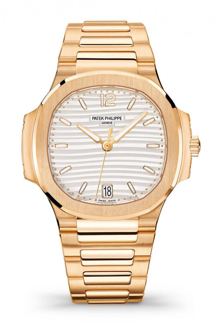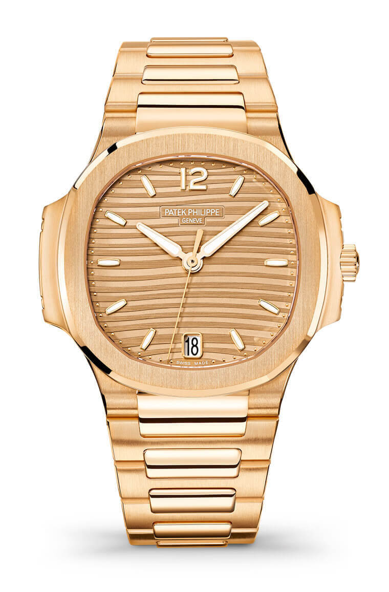 百達翡麗曾於2015年推出Nautilus系列女款玫瑰金鑲鑽腕錶,而在當時推出的時候也受到眾多女性愛戴。因此百達翡麗在2019年,再度推出搭配純金錶圈款式,為這一融匯經典風格與運動特質的女式腕錶系列再添新品 。手錶採用1976年Nautilus 系列首個男式錶款的知名設計,兩個纖長的橫向錶耳模仿舷窗上的鎖與鉸鍊,搭配八邊形錶圈經過圓潤處理且飾有倒角邊緣。錶圈和錶殼頂部經過緞紋裝飾,側邊採用鏡面拋光處理,構成微妙的對比效果,突顯結構的精巧。這次面盤有兩種色彩可選:銀調乳白色和金調乳白色。輕柔的波紋浮雕圖案是Nautilus系列女式腕錶的標誌性特色,賦予手錶出眾的個性。