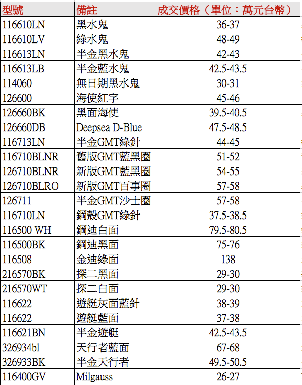從目前勞力士運動錶的實際成交價格來觀察一下為什麼說今年的運動錶旺季會讓人覺得有點沒有往年熱絡,以下提供近期個重點款式的報價表給大家參考: