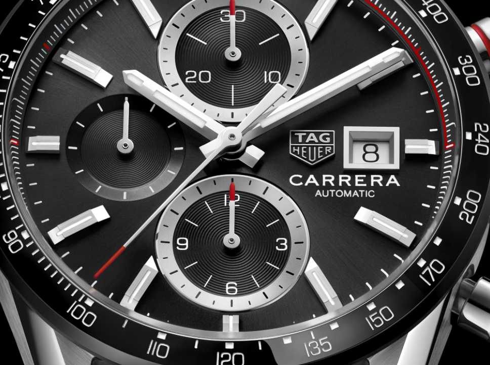 升級版Carrera Calibre 16計時錶較前一代具備更多新穎的設計細節。面盤為黑色或藍色的太陽紋,判讀性大幅提升,適合衝刺終點線的賽車手佩戴,也能滿足閒暇駕車上路的需求。三個計時碼錶小錶面尺寸加大,使其變得更為顯眼。前一代錶面刻度採圓點SuperLuminova® 夜光塗層處理,新版則低調地佈滿整個刻度,在任何情況下都能提供最佳辨識度。