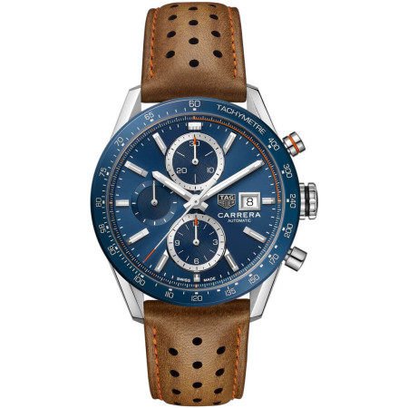 升級版的Carrera Calibre 16計時錶中,就屬搭配淺棕皮革錶帶的藍色錶款最為搶眼,該配色首見於此規格的Carrera系列中。而此款錶所搭配的皮革錶帶縫線與襯裡,皆是沿用與錶面在中央計時秒針前端,與兩個計面盤上的指針的橘色映襯來點綴,展現十足的現代感。手錶皆搭載Calibre 16機芯,底蓋鐫刻Carrera系列名稱與經典賽車格紋,呼應Carrera系列競速冒險的精神。錶冠也升級,採用黑漆以及泰格豪雅盾型標誌裝飾。