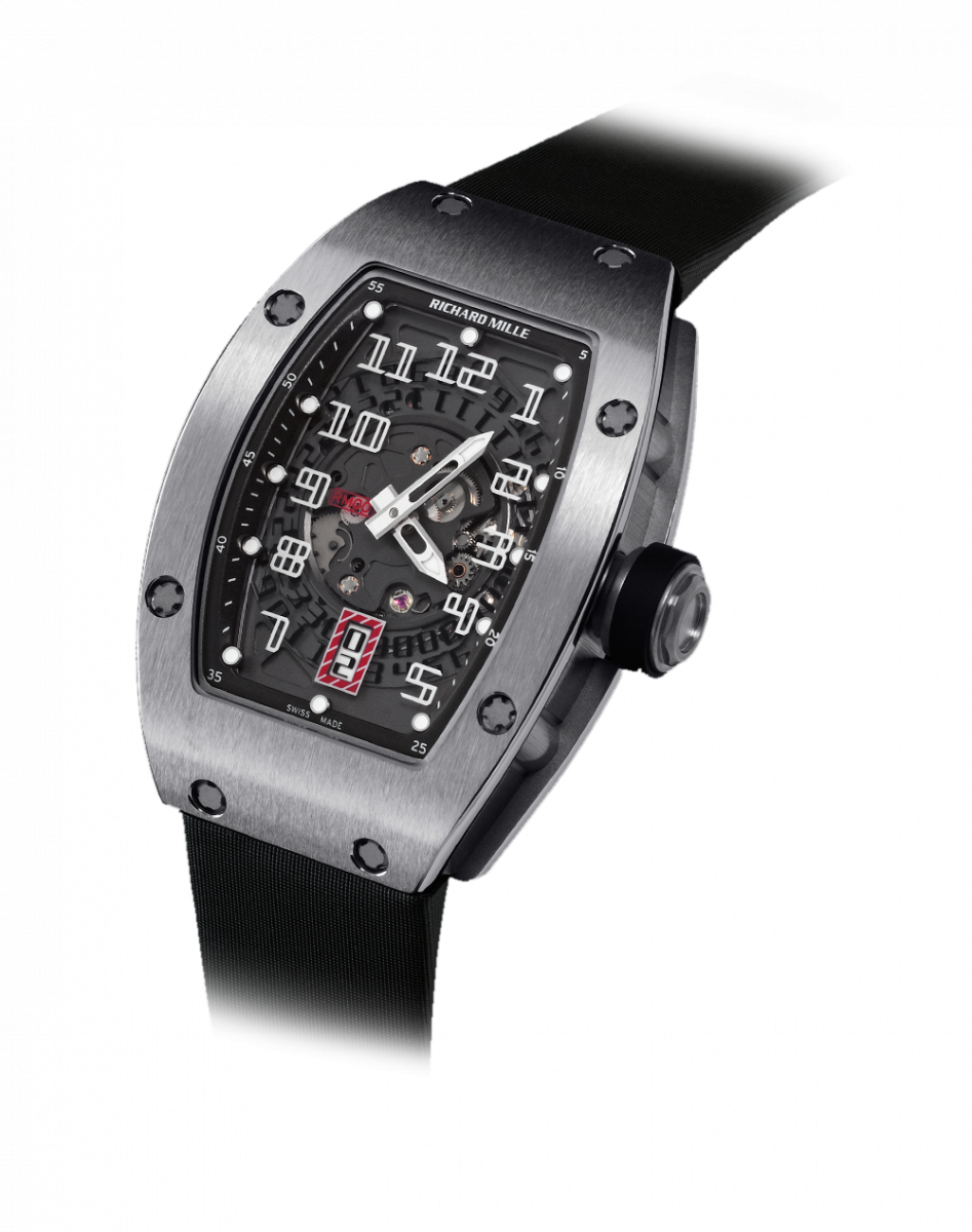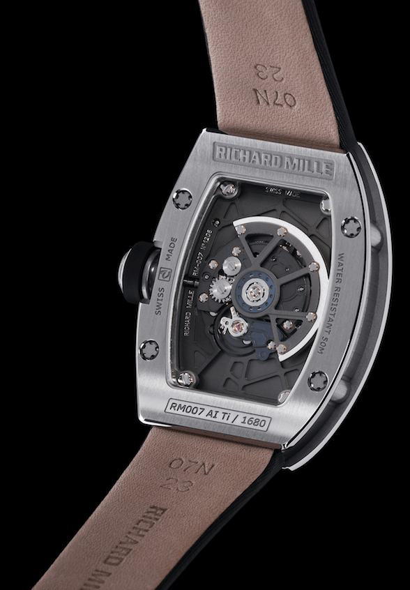 RM 007鈦合金手錶同樣擁有酒桶形錶殼、半鏤空面盤、搭配阿拉伯數字時標,讓這款錶款更加與眾不同。而面盤上的夜光圓點、夜光指針,即便在夜間也能清晰視讀。藍寶石水晶背透蓋由4顆螺絲固定,錶殼、面盤及機芯印有品牌標誌,結合特殊錶殼及半鏤空的機械工藝設計。