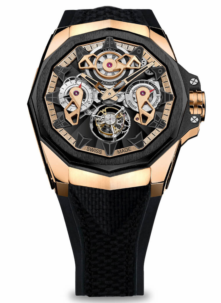 18K玫瑰金、PVD鈦金屬材質/CO 298自動上鍊機芯/時、分、小秒顯示/陀飛輪裝置/動力儲存顯示/藍寶石水晶鏡面、透明底蓋/防水100米/錶徑45mm/限量18只/參考價:NT$ 2,330,000