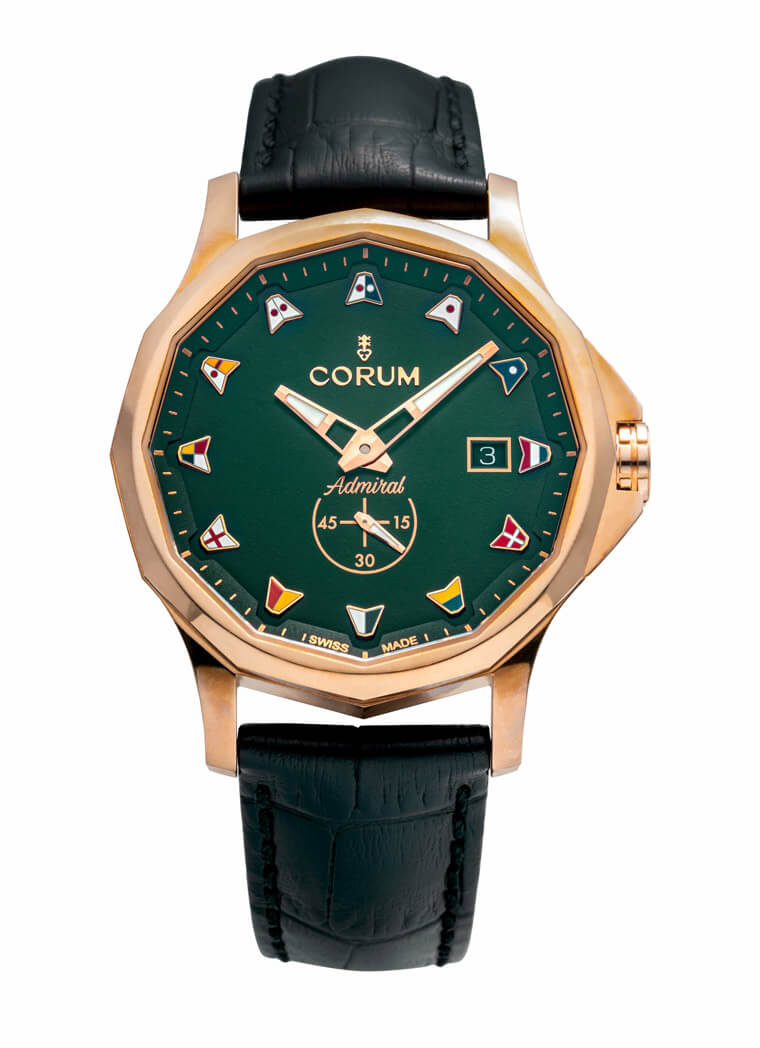 近年來錶壇流行的青銅材質CORUM在這幾年中也陸續投入研發,近期品牌在推出一款Admiral Legend 42青銅錶,這是一款搭載CO395機芯的小三針手錶,相較於前面介紹的幾款,這款青銅錶的海事旗時標相對搶眼,除了每枚時標都具有鮮豔的顏色,時標本身也是以鑲嵌方式固定於面盤上,看起來別具層次感,而這款搭配的綠色面盤與青銅色澤堪稱絕配,等青銅錶殼隨著時間與汗水等因素作用後,錶殼變得深沉的銅鏽色澤會更能呼應綠色面盤。