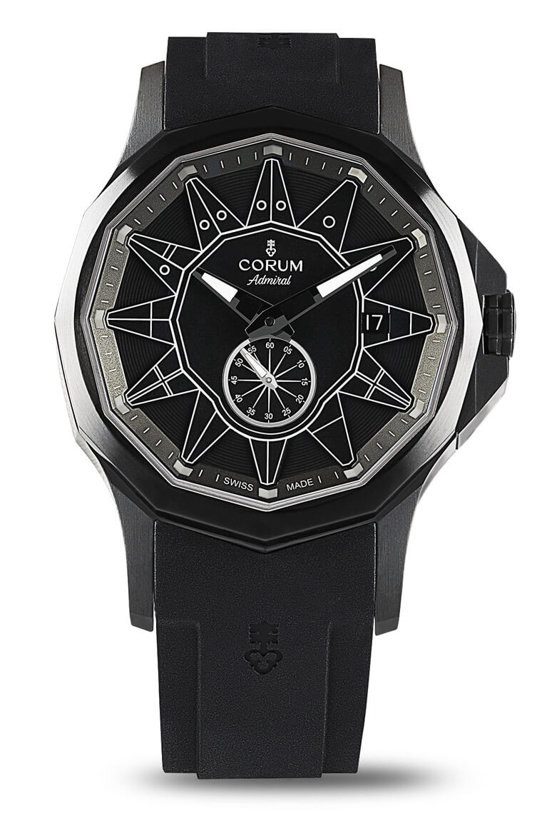 同樣尺寸為42mm的還有Admiral Legend 42 Full Black這款錶,其採用黑色PVD錶殼打造全黑外觀,這也是系列首見全黑色調的新鮮設計,面盤上的海事旗時標被拉長圍繞著面盤中央的小12邊形,並一直延伸直到頂到面盤外緣的12邊形,而這款的小秒盤精細做出每5秒鐘的刻度,讓佩戴者在判讀時間時更有所依據。