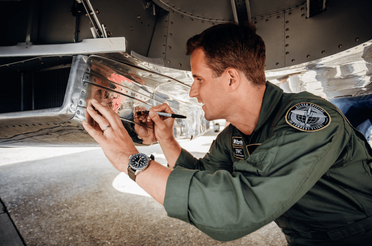 ▲IWC首席執行官Christoph Grainger-Herr佩戴噴火戰機飛行員世界時區腕錶最長的飛行限量版,並且於銀翼噴火戰鬥機上簽名。