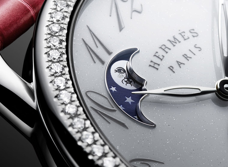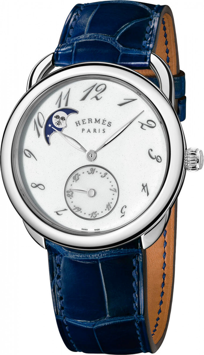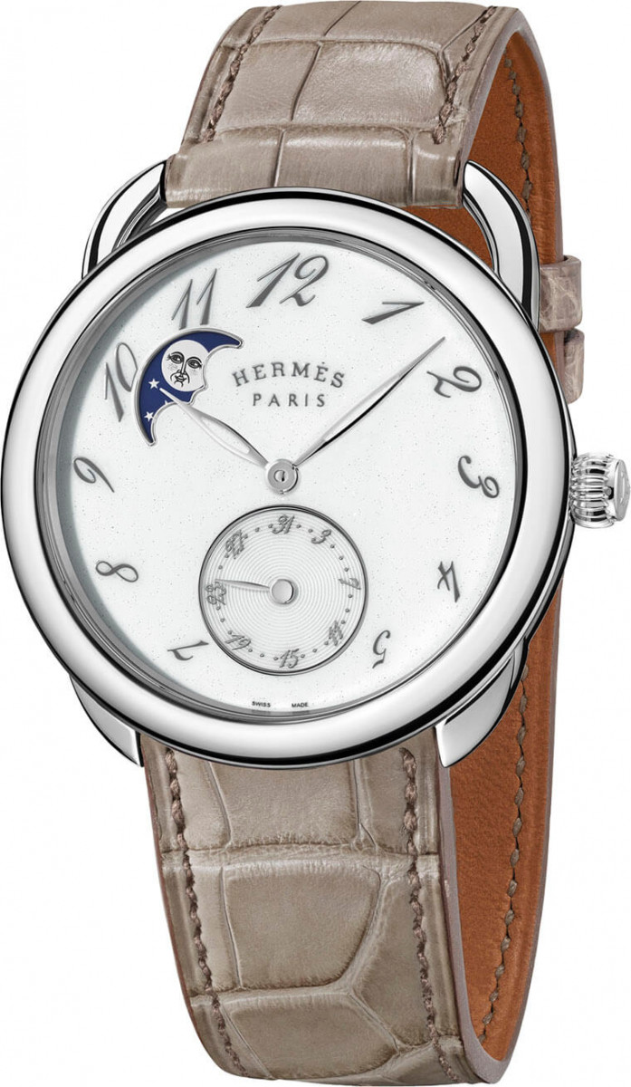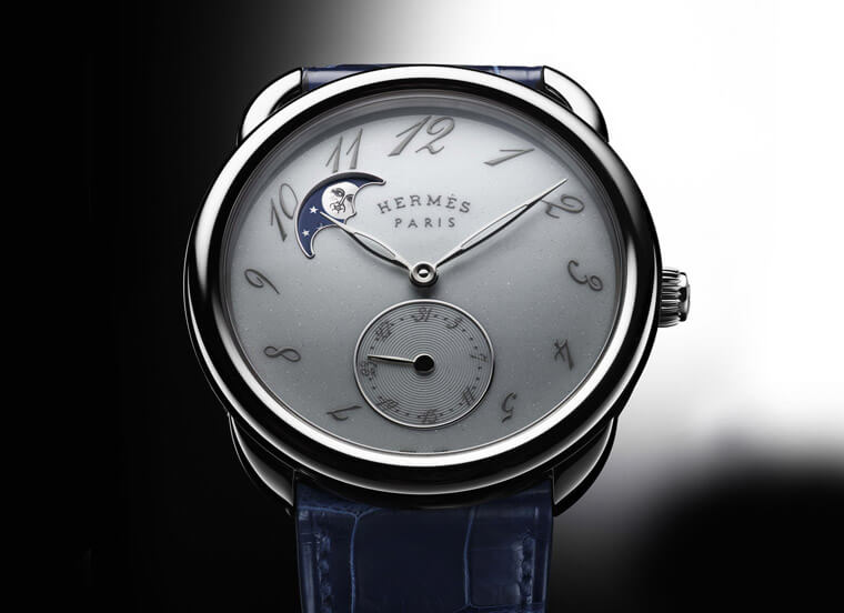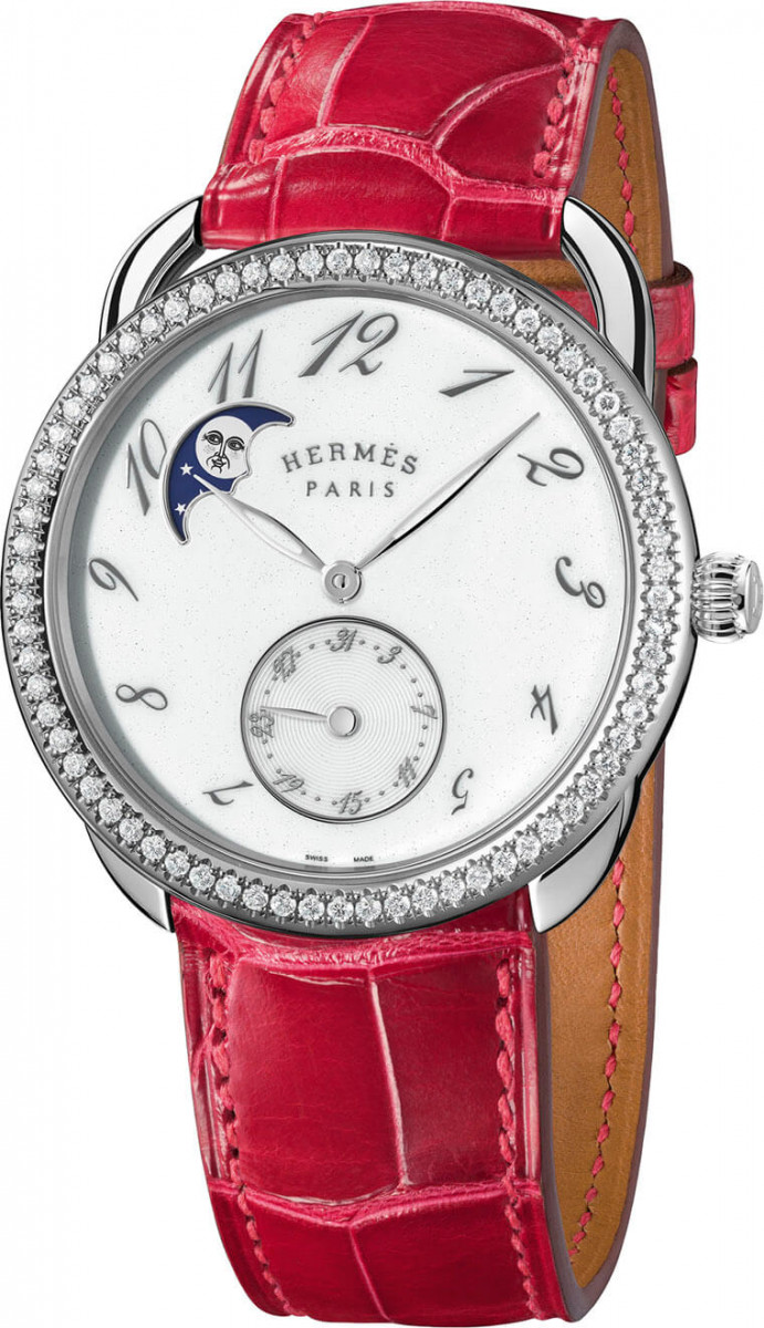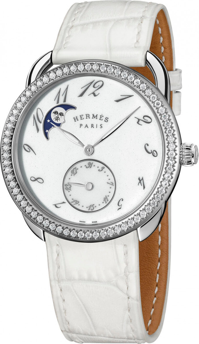 Arceau Petite Lune小月相手錶在2013年時就已經登場過,經過六年之後,愛馬仕再次推出重新設計過的改款新作,新款一律採用不鏽鋼材質,但是可以分為錶圈拋光版本和錶圈鑲鑽版本。面盤上的佈局大致承襲前座的特徵,例如斜體阿拉伯數字時標、柳葉型指針,日期盤和月相窗也同樣位在6點方向和10~11方向,而38mm的錶殼尺寸也並沒有改變,對於女性來說佩戴起來不會顯得太超過。