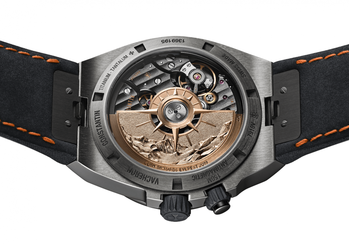 為掌握此次珠峰探險的攀登節奏,Cory Richards需要一款能夠同時顯示尼泊爾當地時間和美國家鄉時間的手錶。為此,他選擇了Overseas兩地時間手錶。而為了紀念此次挑戰以及他對卓越的不斷追求,江詩丹頓特意為他設計了一款原型時計作品,並根據他拍攝的一張珠峰照片在自動盤上雕刻了相應圖案。