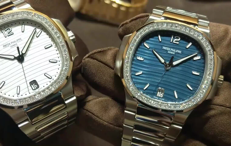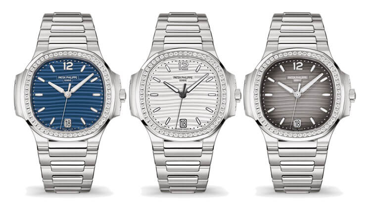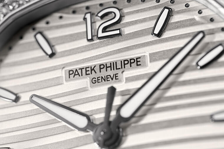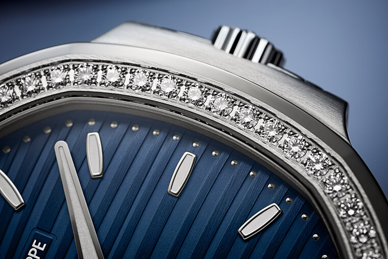 7118與5711看起來有點像但又並非只是把錶徑縮小如此簡單,仔細觀察7118與5711,會發現前者的時標做得比較纖細,12點方向設有阿拉伯數字時標,日期放在六點鐘方向也與男錶放在三點鐘方向不同。手錶兩側的錶耳不鏽鋼結構、以及面盤上的水波紋路令人聯想起船隻舷窗,這點又跟男錶那種水平紋路同中求異。而雖然7118/1200A的材質選用不鏽鋼製作,但經典的圓滑八角形錶殼讓看似結構結實的骨架,帶有優雅的味道,別忘了百達翡麗還在錶圈鑲上56顆鑽石,這使得單純的不鏽鋼錶殼多少帶點小騷包的華麗光芒。