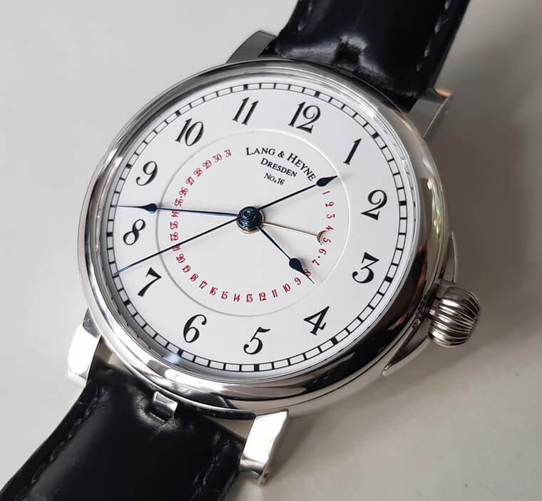 再來是LANG & HEYNE,他們家以懷錶工藝為基礎,蘊含傳統製錶價值。Konrad是ANG & HEYNE最具代表性的錶款,具有恆定動力、跳秒功能以及琺瑯面盤。指針式日期在31日到1日時,會從上方掠過品牌Logo,而非逆跳。這款的機芯夾板以手工霜金處理,類似早期的鎏金,擺輪軸心上方鑲嵌鑽石,雙層游絲,螺絲平衡擺輪,震頻為18000轉。