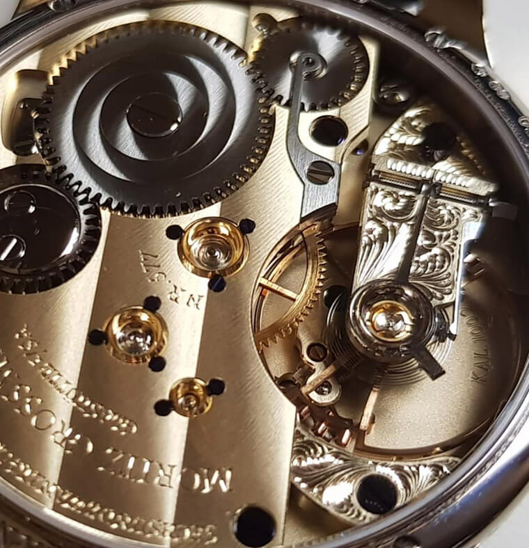 另外MORITZ GROSSMANN也不容小覷,這個品牌具有很多獨創的細節,在其他瑞士錶身上不容易見到,展現德國的工藝特色。品牌名作如Benu Power Reserve,指針為紫棕色退火鋼。在錶殼右下方的按把是特色,調校時間只要拉出錶冠即停秒(此時錶冠會彈回),調校時間後只要壓下按把即可啓動擺輪。優點在於不會影響分針的對時,此概念來自懷錶,是手錶首創的設計。MORITZ GROSSMANN的機芯處處令人感到驚豔,擺輪與擒縱輪夾板的雕飾深邃,微調刻度也是以手工精雕(手錶上首見)。擺輪結構有雙邊對稱的凹槽,內部兩側各有1顆平衡螺絲,中間另有1顆用來微調快慢。擒縱叉的限位釘位置也與傳統結構不一樣,位居擒縱叉後方而非一般的兩側。微調方式與早期懷錶相同,亦為手錶首見,一字型的螺絲微調又稱Grossmann微調機制。機芯軸承寶石為透明而非紅色,金質套筒凸出機芯夾板,與夾板在不同水平。