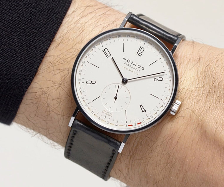 Tangente本身在NOMOS旗下算是那種老牌的系列了,而Tangente Update名為「升級」,代表它一方面延續系列的精髓如簡潔外觀、特色時標字體等,同時它也有一些自己的革新變化如錶徑加大到40.5mm、跳脫傳統的日期顯示方式,再來就是搭載品牌第二款自製自動機芯DUW 6101,它雖然多了日期模組,但是其整體厚度還是維持在3.6mm的水準,延續DUW 3001的纖薄風格。佩戴在手上時除了外觀很俐落,佩戴的舒適度也是它受歡迎的其中一個原因。