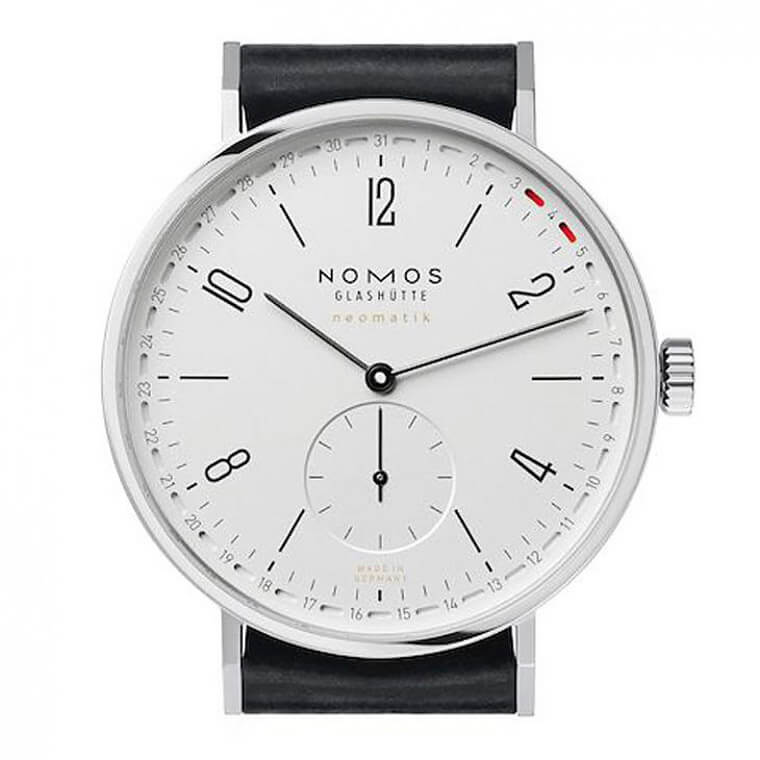 ▲Tangente Update在面盤外緣可見日期轉盤以兩個紅點標示當前日期,彰顯了Tangente錶款以設計為導向的特點。這種日期顯示屬於全新設計,為NOMOS獨有。