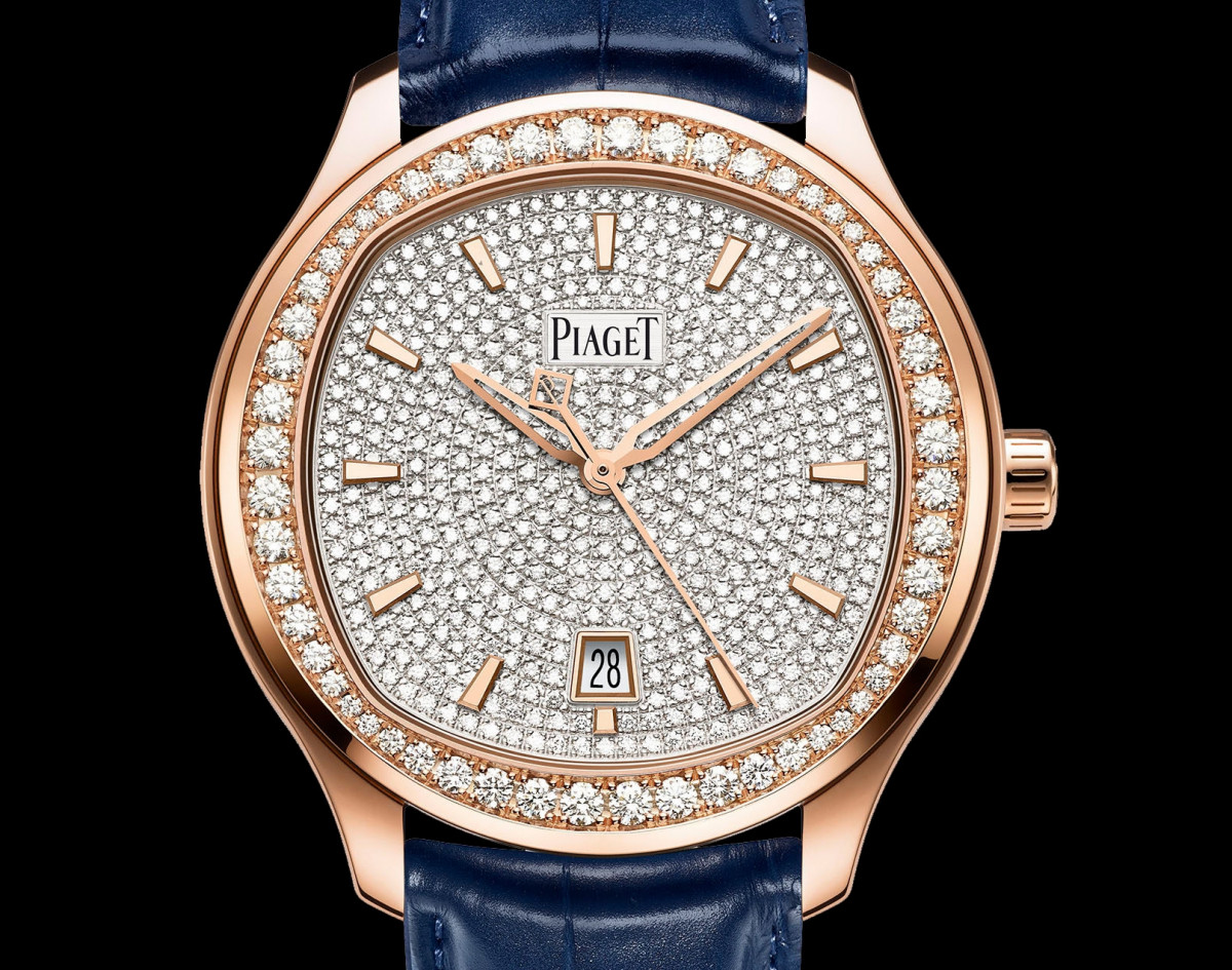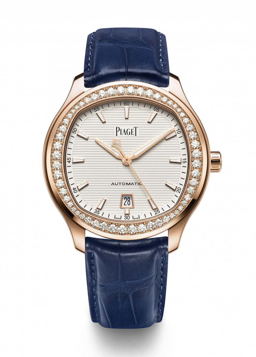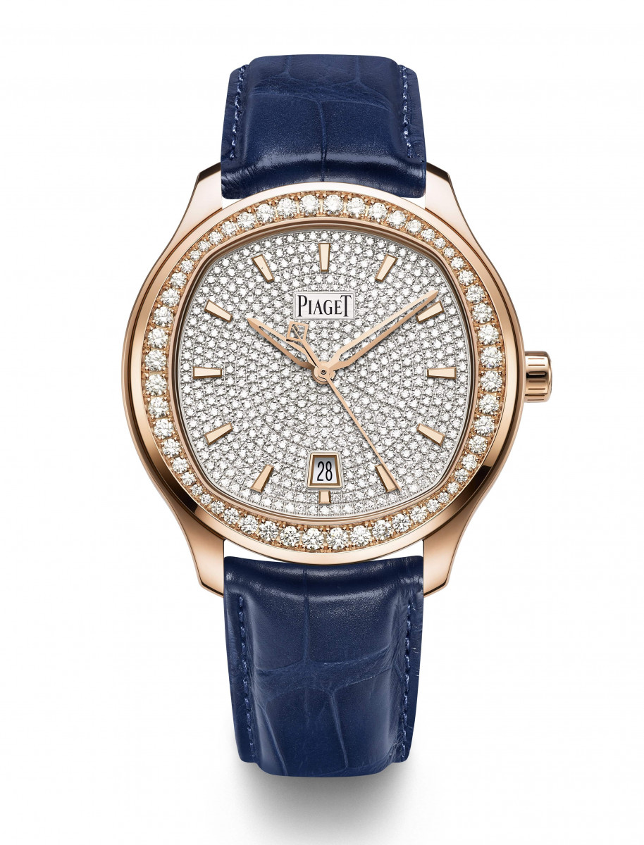 全新的Piaget Polo鑲鑽手錶,換上18K玫瑰金錶殼,共有兩款鑲鑽設計。一款配備經典鑲鑽錶圈,圓形美鑽形成簡約迷人的光環;另一款則以美鑽密鑲於面盤和錶圈,盡展流光溢彩的美態。兩款手錶均搭配兩條鱷魚皮錶帶,可隨意搭配百變造型。深藍色錶帶突顯錶殼上閃爍的鑽石光芒,棕色錶帶則與玫瑰金錶殼的溫潤相互輝映。