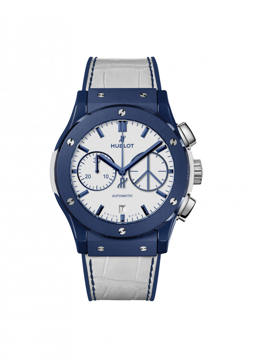 2019全新經典融合系列伊比薩計時錶,以45毫米拋光藍陶瓷錶殼,搭配同色系錶圈,讓人聯想到蔚藍的天空以及海洋。搭載HUB1143自動上鍊計時機芯,提供42小時動力儲存。位於3點鐘方向的小秒盤,顛覆傳統,有著代表和平的標誌,意謂著伊比薩島上所傳遞的嬉皮文化。錶背刻有"Hublot Loves Ibiza"的字樣採用白色鱷魚皮和藍色橡膠雙材質錶帶,並裝飾藍色縫線。