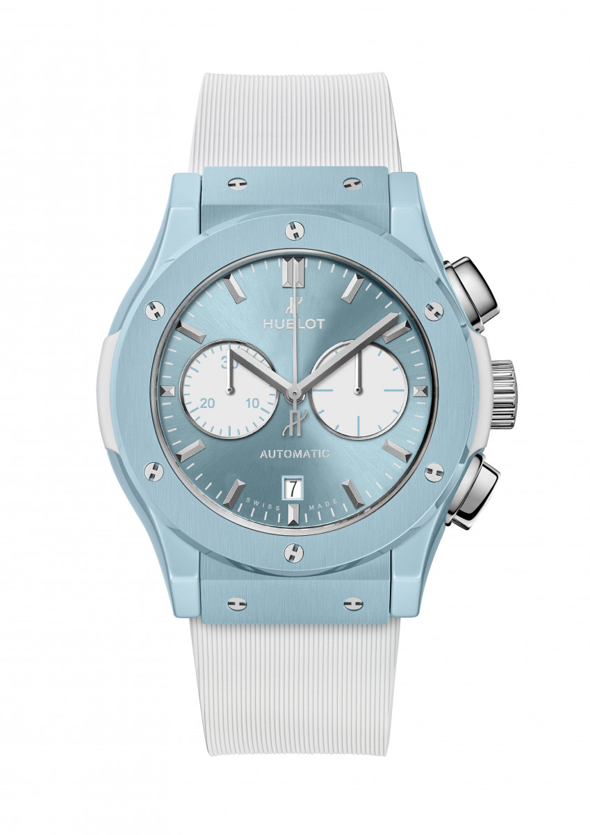 2019年剛好為卡布里島宇舶專賣店開幕滿兩週年,為了紀念這個時刻,宇舶推出了全新的經典融合系列卡布里島計時錶,以創新晴空藍陶瓷打造,刻劃島上得天獨厚的浪漫氛圍與天然神奇景緻。純白色橡膠搭配晴空藍陶瓷,記錄夏日美好時光,也將這座島嶼最具代表的景緻—情人岩,全部凝縮在方寸之間。