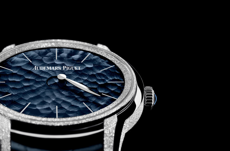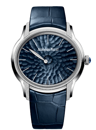 這只具抽象意念的手錶由製錶師精心手工製成,以最崇敬的態度體現愛彼的傳統精神。18K玫瑰金或白金錶殼配以拉絲打磨並以霜金工藝,這種自佛羅倫斯的珠寶設計師Carolina Bucci的黃金錘擊技術加予裝飾。要打造如鑽石粉塵的效果,必須經過數小時的超微錘擊工序。