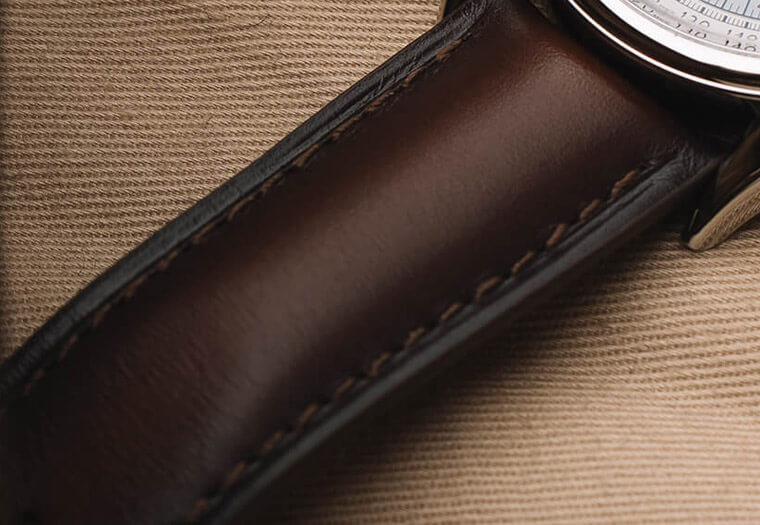 不鏽鋼款的Historiques Cornes de Vache 1955其實和貴金屬大同小異,外觀特色如牛角錶耳、較1955年原版更大的錶徑(復刻款錶徑為38.5mm),以及雙眼錶盤和面盤外圍的測速計刻度等都沒變,倒是面盤採用了名為乳光灰色並帶點天鵝絨質感的新設計,用來與錶殼同樣看起來是銀白色的白金版本作出細部的區隔,而不鏽鋼款的Historiques Cornes de Vache 1955還有一個小彩蛋在於錶帶,有別於前兩款貴金屬錶殼使用的是鱷魚皮錶帶,江詩丹頓這次找上了義大利頂級皮具品牌SERAPIAN合作,他們選擇了深棕色小牛皮來製作手錶錶帶,而SERAPIAN除了把錶帶做得帶有懷舊質感,他們還從自家的手提包上移植靈感,將包包提手的連接扣造型套用在錶帶活動環的設計上,因此有機會看到這款錶的話,不妨注意一下它的錶帶是會有點不同的。