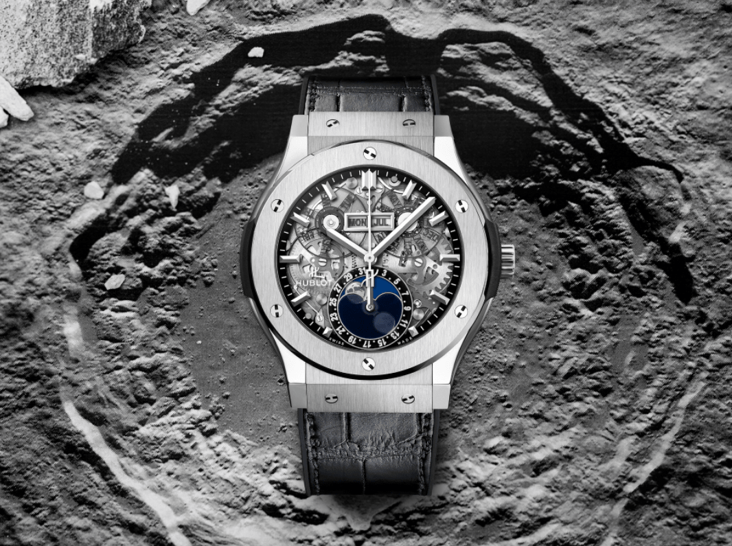 手錶拋光黑陶瓷款神祕性感,宛如月之暗面,鏤空面盤將機芯的祕密公諸於世人面前。鈦金屬款則採用輕盈高硬度的航太材質打造,宛如登月小艇一般,輕盈降落在手腕。鏤空面盤透視機芯複雜功能,星期與月份視窗在12點鐘位置,日期指示則與月相共同融合於6點鐘位置的小錶盤,佈局巧妙,易於閱讀,鏤空面盤可欣賞複雜機芯的運作機制。