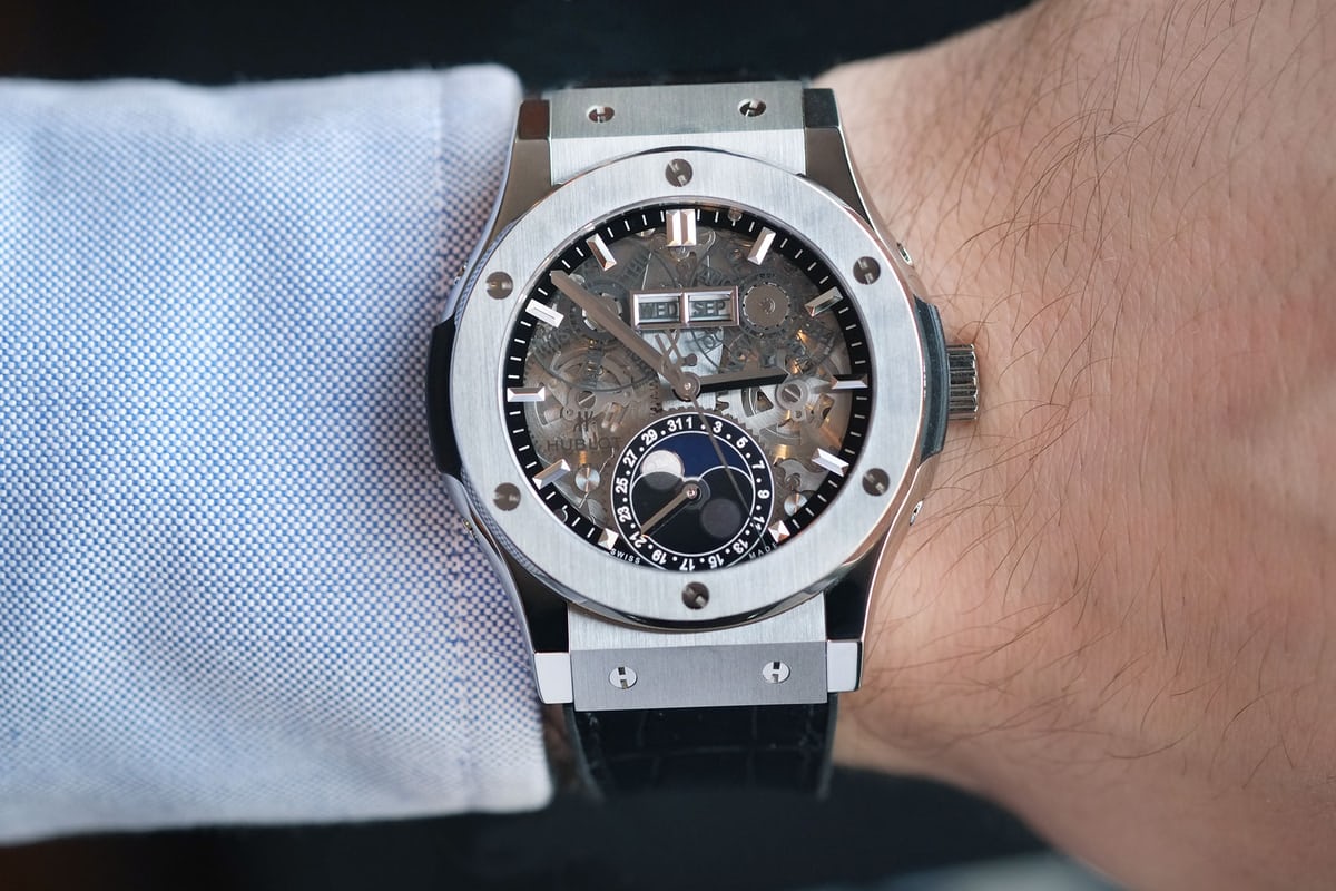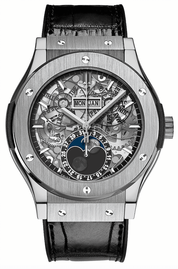 鈦金屬材質/HUB1131自動上鍊機芯/時、分、秒、日期、星期、月份顯示/月相顯示/藍寶石水晶鏡面/防水50米/錶徑45mm/參考價:NT$ 484,000/另有皇金、陶瓷款式
