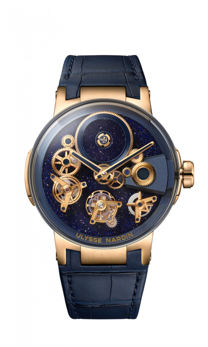 K金材質/UN-176自動上鍊機芯/時、分顯示/陀飛輪裝置/動力儲存顯示/砂金石面盤/藍寶石水晶鏡面、透明底蓋/防水30米/錶徑44mm