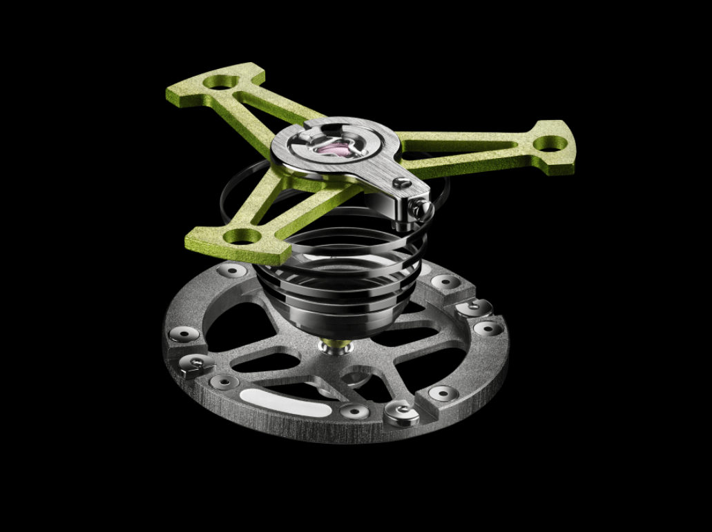 游絲所採用碳纖維複合材質的奈米級圖案呈六角形,再以此為概念應用於手錶的設計。除了搭載碳纖維複合材質游絲,其最搶眼的特色在於多層次面盤與機芯組合,透過鏤空面盤可以看到機芯夾板上鮮明的噴砂和精磨六角形圖案。該圖案也出現在自動盤上。經黑色PVD處理的自動盤透過藍寶石錶底蓋清晰可見。活潑的螢光綠勾勒出腕錶的不同元素,搭配鋁製夾板和陀飛輪機芯上的鐫刻圖騰,令人聯想起昔日的鐘錶創作歷史。