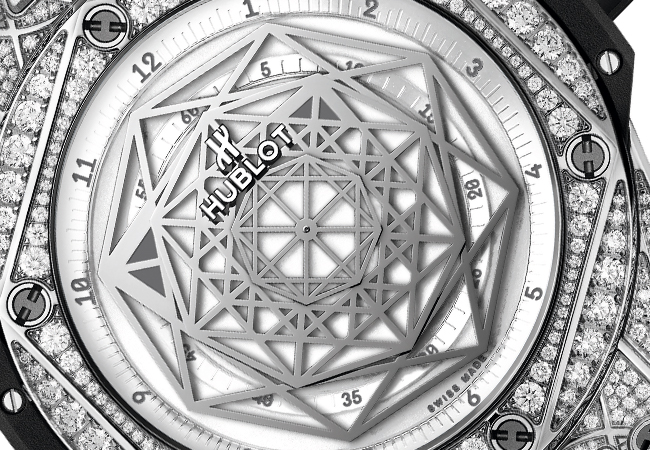 Big Bang Unico滿鑽手錶造型加入了幾何效果的斜角線條,錶圈也由原本的圓型改變為六角造型。這些全新的設計元素,賦予Big Bang手錶視覺上更加立體的3D效果。霧面黒色面盤之上,呈現出粗黒緞面抛光圓環,其上印有小時標記。阿拉伯數字的字形是Maxime Büchi專為這款手錶而全新設計的。至於秒針指示,源自上述金屬雕塑中的圖像,裝飾於面盤之上。就像是為了要強調他的神祕性格,並賦予時間另一種維度,面盤上沒有任何指針。