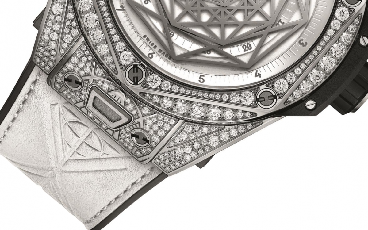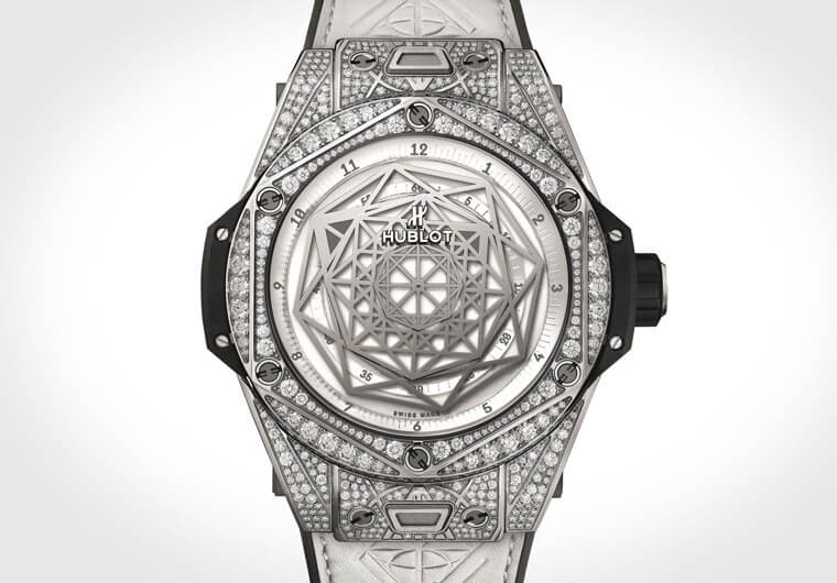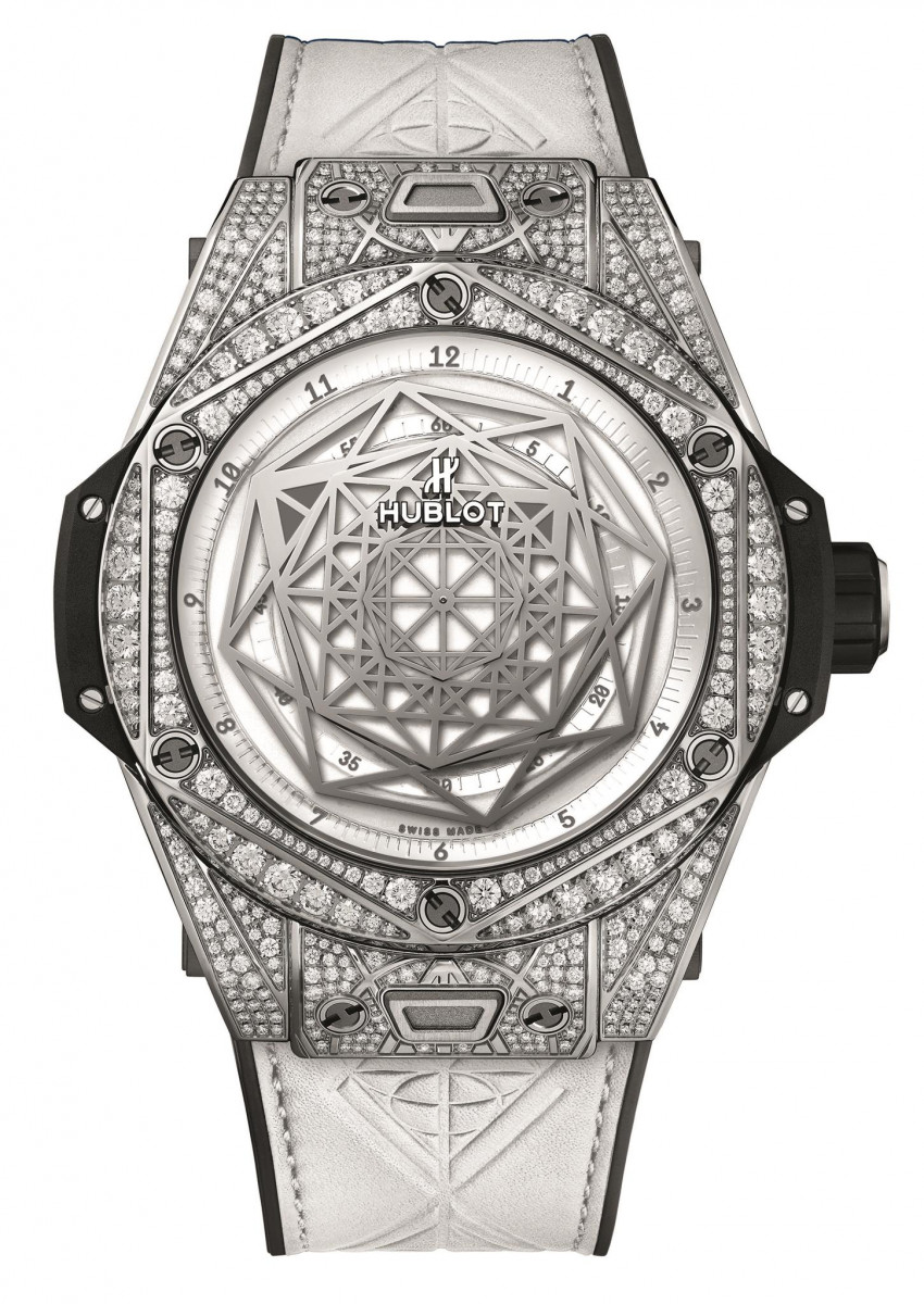 以鈦金屬打造的Big Bang Unico Sang Bleu滿鑽手錶,搭載HUBLOT原廠自製Unico自動上鍊機芯,針對全新功能重新設計,移除了原本的計時碼錶模組,並增加了顯示時、分、秒的三組碟盤。面盤上的圖案延伸到鈦金屬錶殼之上,以金雕方式刻印出類似雕塑上的幾何線條,備白色小牛皮錶帶,以熱壓印做出黒色到灰色的漸層效果,內層並襯有佩戴舒適的橡膠材質。