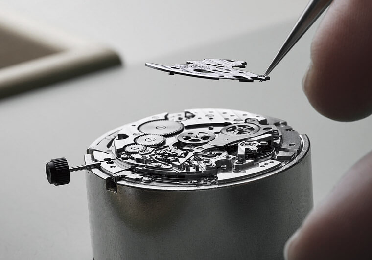 機芯的自動上鍊是利用切換輪的機制做雙向上鍊,整套上鍊機構從錶背來看就位在大捲車的右方,由單一一枚夾板固定住。BVL 318的版路分件算是相當簡潔,基板之上就是一大塊主橋板蓋住所有走時輪系(自動上鍊機構則是鎖在這塊主橋板上),最後再覆上一枚錶橋固定計時輪系,也就是現在看得到導柱輪的這枚,至於擺輪則具備了獨立的橫跨式錶橋。簡單的分件以及盡可能平面化的分層都有助於減少機芯厚度,而強度和穩定度則是透過其他方式來補強。