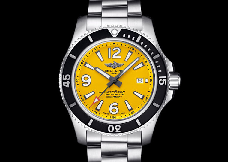 百年靈跟黃色滿有緣的,畢竟品牌Logo就有黃色,因此黃色面盤雖然在錶壇中算是比較冷門的顏色,但他們家推出黃色手錶的頻率還算高,2019年SuperOcean一口氣發了很多黃面手錶,有不鏽鋼也有黑鋼,也有搭載不鏽鋼鍊帶或橡膠錶帶的款式,這款身上還是採用舊式的品牌Logo設計,感覺上有一對翅膀的百年靈Logo看起來還是比較習慣。