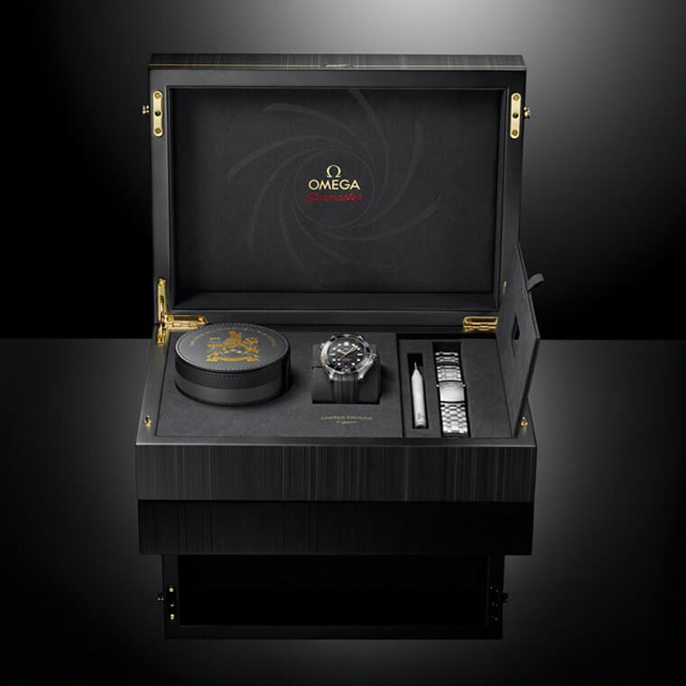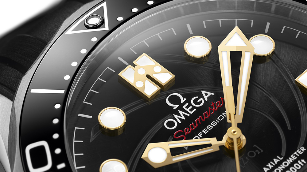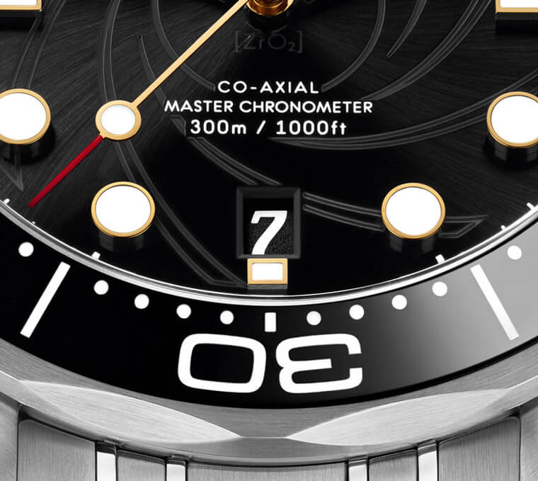這只手錶搭載黑色PVD陶瓷面盤,而面盤最特別的設計在於採螺旋磨砂槍膛紋理設計、面盤中心則是一顆9毫米的子彈頭。在錶殼的側邊,歐米茄裝設一片18K黃金板,上頭鐫刻這款限量腕錶獨一無二的編號。指針與時標也以18K黃金打造而成,包括靈感源自龐德家族紋章的12點鐘時標。而在每個月的第7天,日期視窗顯現的數字"7"使用的是與007標誌相同的字型;10點鐘時標還有一個隱藏的"50",這個以Super-LumiNova超螢光塗料打造的祕密數字會在夜晚顯現。