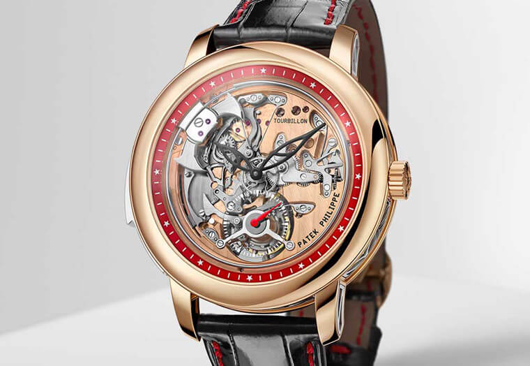 在百達翡麗鐘錶藝術大展期間,品牌也同步發表多達6款的全新創作,這些作品都未在2019年的Baselworld錶展中曝光,是首度和世人見面的錶王生力軍,其中最能展現百達翡麗頂尖身手的當屬Ref. 5303R-010 Minute Repeater Tourbillon,顧名思義這款錶集結了三問和陀飛輪兩項複雜功能,同時面盤還採用了開面設計露出立體的機芯結構。Ref. 5303R-010採用玫瑰金錶殼,錶側鑲上白金鏤空嵌件,這有別於一般的金雕,有點像是把白金鑲嵌到玫瑰金上的設計,另錶款呈現出一番新氣象。錶款的面盤外圈設有紅色的刻度環,時標改成星星圖案,這與新加坡國旗有彼此呼應的味道,而機芯機板經過鍍玫瑰金處理呈現與錶殼一致的色調。得力於開面設計的關係,所以Ref. 5303R-010在六點方向露出了陀飛輪裝置的背面,百達翡麗額外在此處家裝了一枚指針用以作為小秒顯示之用,在此之前,百達翡麗的陀飛輪基本上都是真人不露相置於錶背,據說是要減緩紫外線照射加速潤滑油乾涸的情況,而這次品牌做出了重大改變,然而為了不與自身的堅持衝突,因此錶款也特地在陀飛輪框架上的藍寶石圓盤上塗上防紫外線的塗層。
