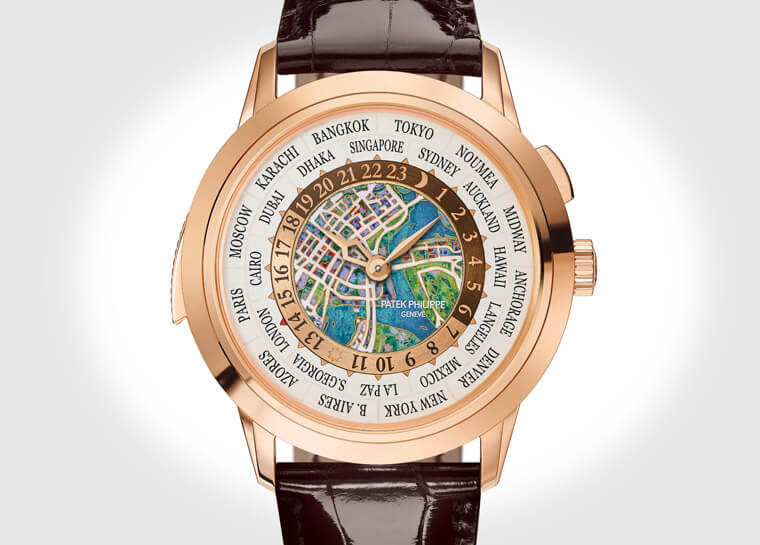 還有一款Ref. 5531R-010 World Time Minute Repeater則是展現出與新加坡強烈的地緣關係,這款錶在上一屆的紐約百達翡麗鐘錶藝術大展已經推出過紐約日、夜限量版,2018年也有換上日內瓦湖圖案的市售版,而在新加坡百達翡麗鐘錶藝術大展則是推出了屬於新加坡的限量款——主要的差別即在於面盤圖案換上了新加坡地圖的掐絲琺瑯圖案,另外世界時區環原本的香港欄位則以新加坡取代,除此之外,Ref. 5531R-010基本上和幾款前作規格大致相仿,例如18K玫瑰金錶殼以及錶側的手工飾釘圖案。錶款搭載的R 27 HU機芯不僅結合三問與世界時區兩大功能,同時它的三問報時時間指示的乃是所在地時間,展現與一般同級功能有別的貼心設計效果。