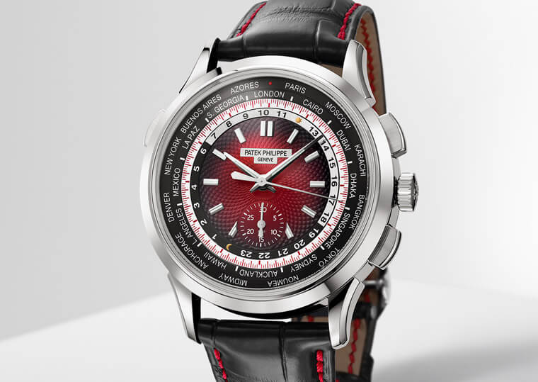 接著看到的Ref. 5930G-011 World Time Chronograph也是百達翡麗繼2016年的同款作品後再推出的改款,這款錶在2016年新推出以前,百達翡麗曾經很長一段時間沒有出現這種世界時間加計時功能的組合。錶款這次還是採用白金錶殼,但是面盤的色調則從原本的藍色變成黑-紅漸層,據稱這是為了配合新加坡展覽,呈現出東方成功和吉祥寓意的關係所採用的新色。錶款面盤走的是簡潔風格,由於外圍的世界時區城市環已經占去了相當的空間,為了不讓面盤看起來太過擁擠,因此品牌僅在6點方向設置了30分鐘計時盤,得力於百達翡麗的精密設計,因此中軸的計時秒針甚至能夠充當一般的走時秒針使用而不會對機芯造成額外負擔。與前面介紹的5531R類似,這款錶為了展現與新加坡百達翡麗鐘錶藝術大展的關聯,刻意將代表香港的城市欄位換成新加坡,底蓋上一如前兩款都有與本次展覽相關的標誌印在透明底蓋上。