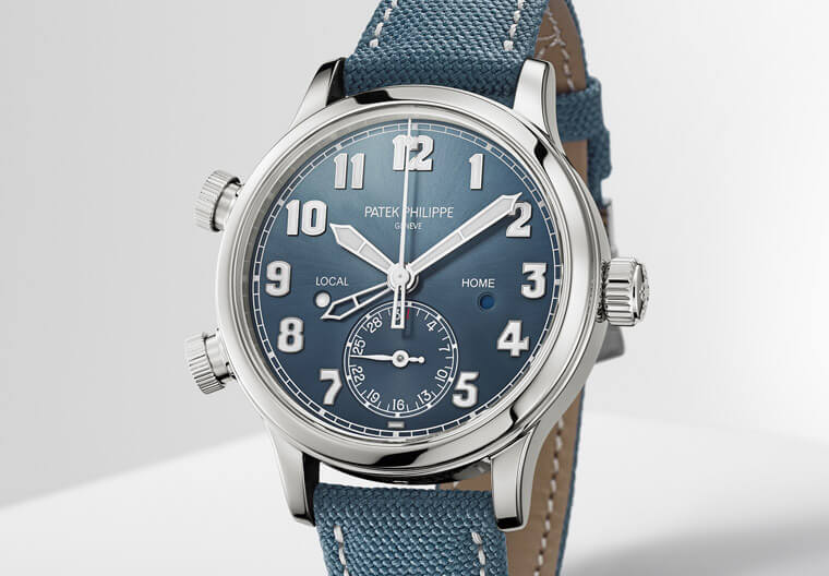 最後要看到的是Ref. 7234A-001則是百達翡麗旗下飛行錶的女錶款式,這款也曾在2018年推出玫瑰金咖啡色面盤版本,到了新加坡百達翡麗鐘錶藝術大展上所推出的新作則改為這系列飛行錶男、女錶款式罕見的不鏽鋼材質。錶款同步換上了藍灰色調面盤,與前面介紹的限量版多採用黑色配紅色的設定不同,據說百達翡麗是以東南亞地區的海景為靈感而使用了這個配色,此外它搭配了帶有編織紋路的藍色小牛皮錶帶,也同樣是這系列中首見的嘗試。錶款的兩地時間功能透過中央第四枚指針指示,同時百達翡麗貼心地設置了所在地與原居地的日夜顯示讓人不容易混肴時間的白天與夜晚之分,閱讀時一目了然,而它位於錶殼左側的快調按把由於具有專利安全保險栓機制,大大降低平時誤撞誤調時間的可能,對佩戴者而言又是一項貼心的設計。