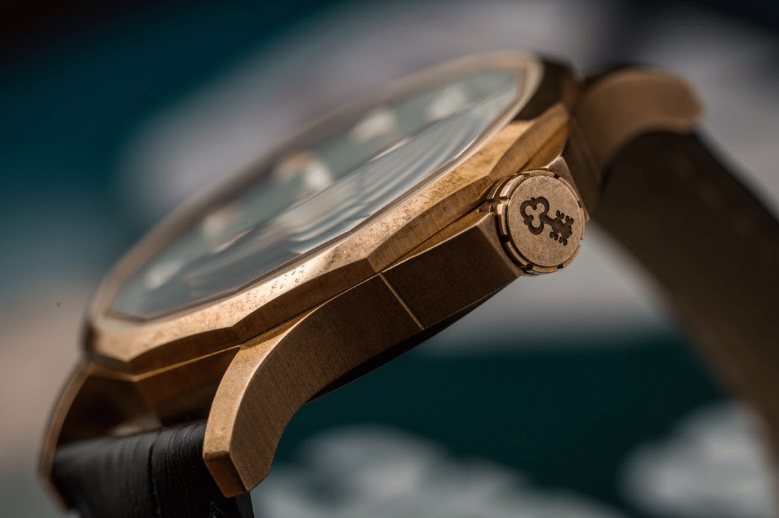 新款Admiral Legend 42以青銅打造標誌性的十二邊形錶殼,獨特的材質特性會受汗水、溫度等環境因素影響而產生反應變化出不同深淺的色澤與銅鏽,因此隨著每個佩戴者不同的使用習慣,錶殼會出現專屬於個人的印記,是最能記錄個人歲月痕跡的材質。錶殼細節也十分講究,在不同的平面上分別採用拋光與拉絲紋兩種打磨修飾,就連錶圈與錶殼間狹窄的厚度也毫不馬虎。