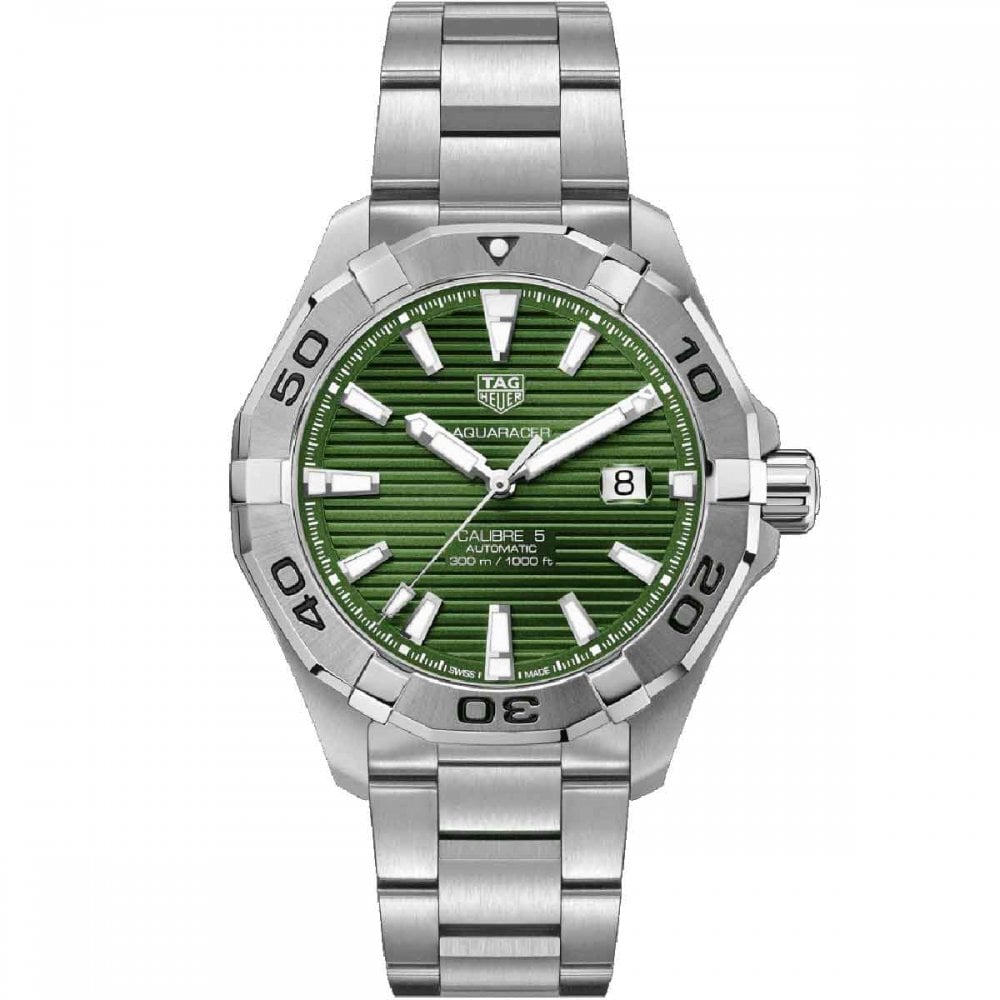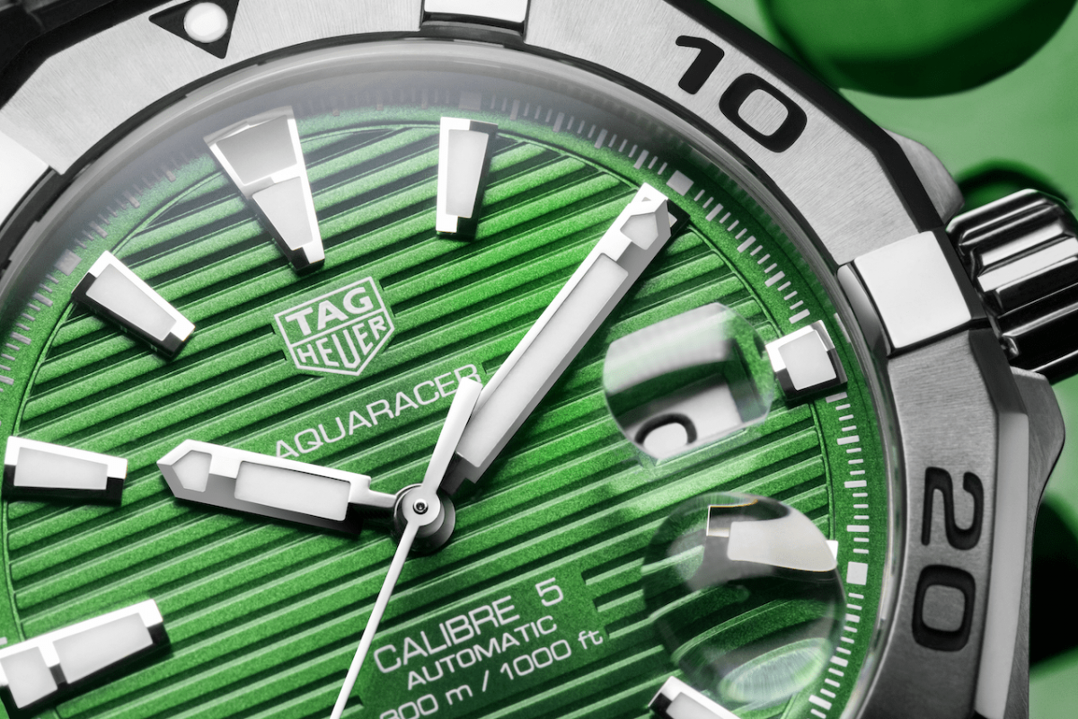 Aquaracer手錶的綠錶面款不僅顏色吸引人,光線雕紋裝飾更令人眼睛一亮。橫跨錶面的水平線條設計發想自帆船停泊的木棧碼頭。面盤3點鐘位置設有日期顯示窗,錶圈數字與12點鐘位置的三角形時標皆以黑漆填滿。且手錶搭載Calibre 5自動上鍊機芯這枚機芯具備28,800次震頻,38小時動力儲存標準規格被充分運用在旗下各系列中,絕對是豪雅最具指標性的機芯之一。